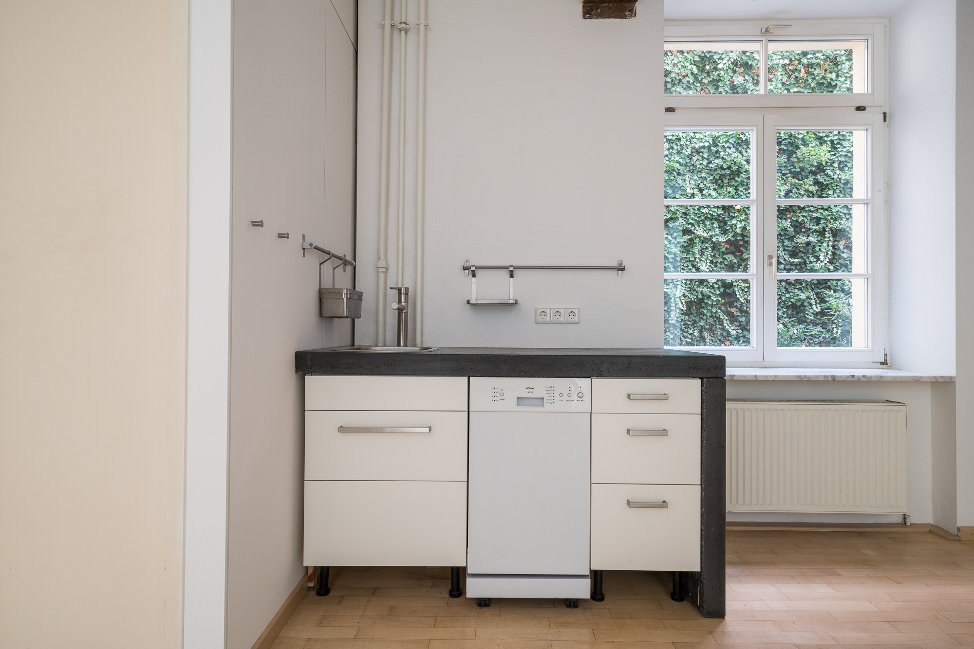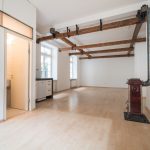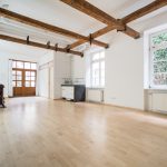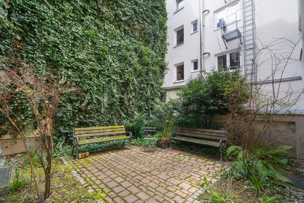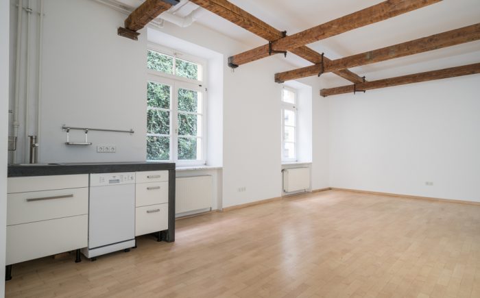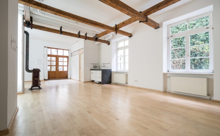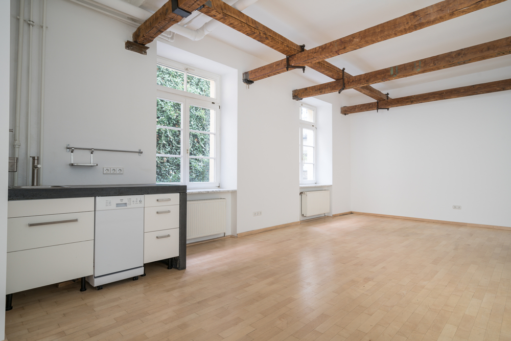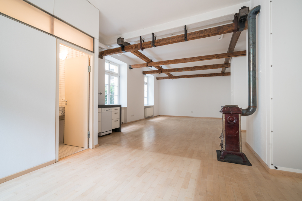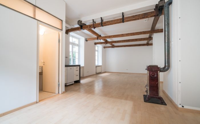 Der mit hellem Ahornparkett ausgelegte Raum strahlt durch eine Deckenhöhe von 3,20 m und den eingezogenen Deckenbalken eine tolle Atmospähre aus. Der Raum ist mit mit einer Zentralheizung ausgestattet, verfügt jedoch auch über Kaminanschlüsse. Ein großzügiges Bad mit Dusche und WC ist in den Raum integriert – ebenso findet eine Küchenzeile Platz. Ein hübscher begrünter Innenhof grenzt an die Räume an und sorgt für eine grüne Aussicht.