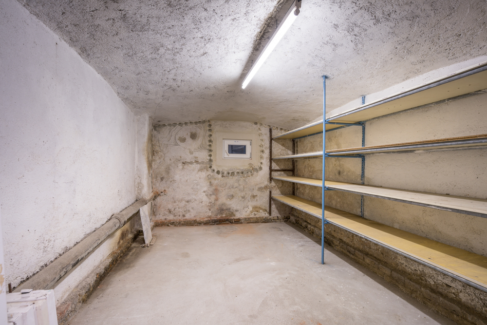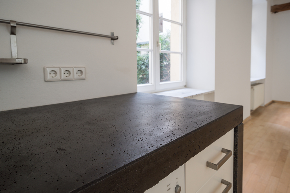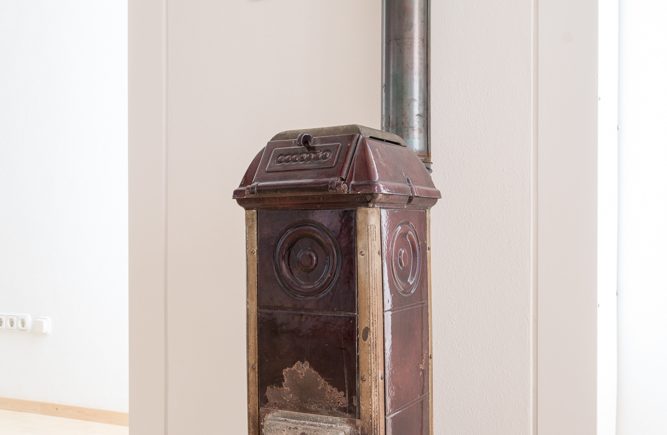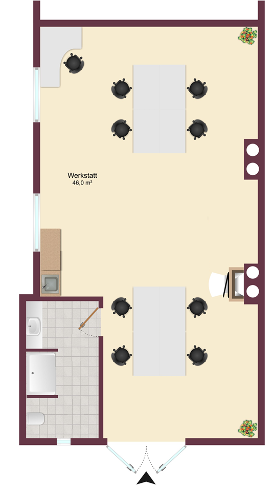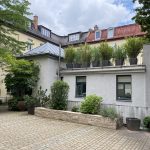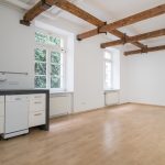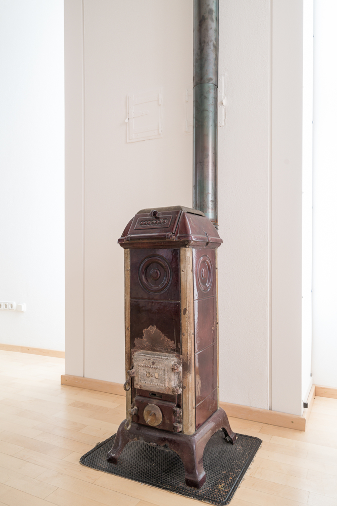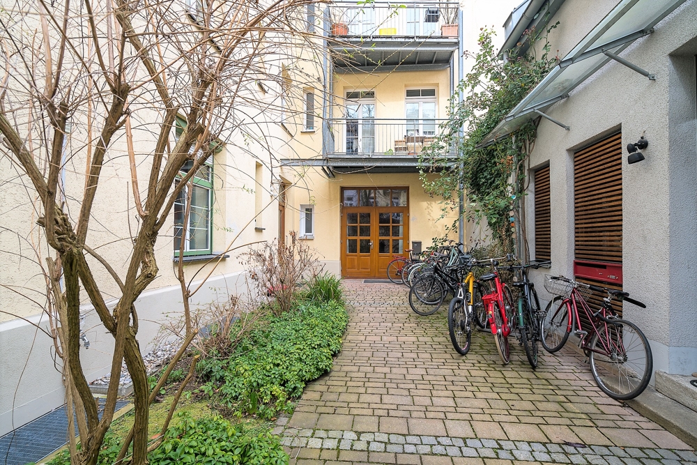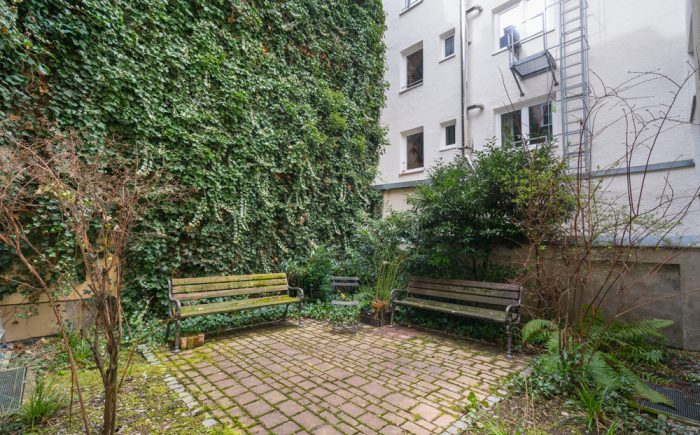 Der mit hellem Ahornparkett ausgelegte Raum strahlt durch eine Deckenhöhe von 3,20 m und den eingezogenen Deckenbalken eine tolle Atmospähre aus. Der Raum ist mit mit einer Zentralheizung ausgestattet, verfügt jedoch auch über Kaminanschlüsse. Ein großzügiges Bad mit Dusche und WC ist in den Raum integriert – ebenso findet eine Küchenzeile Platz. Ein hübscher begrünter Innenhof grenzt an die Räume an und sorgt für eine grüne Aussicht.