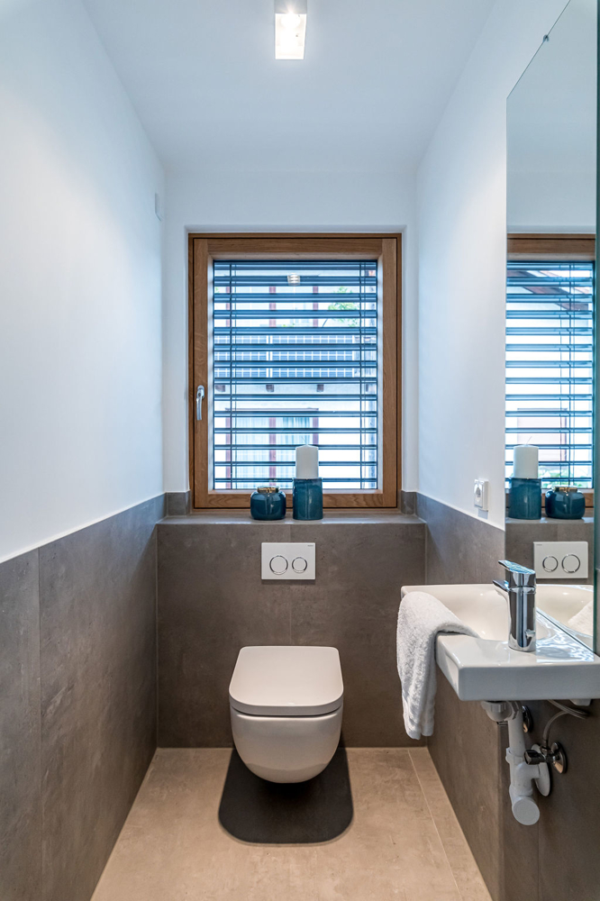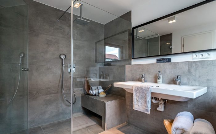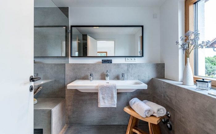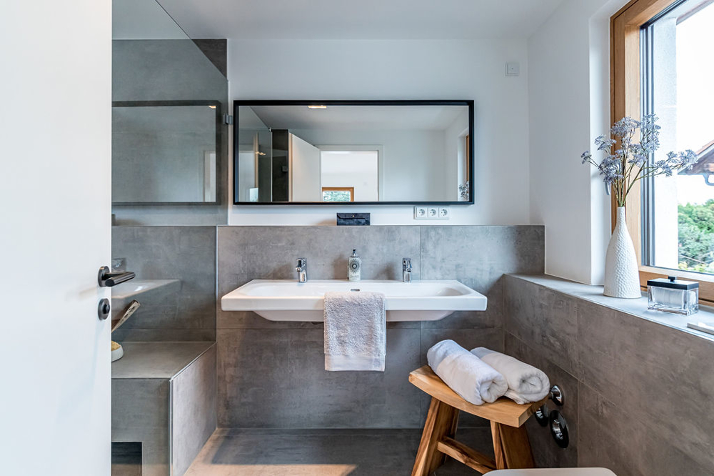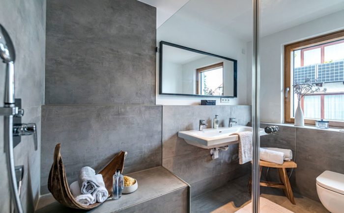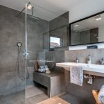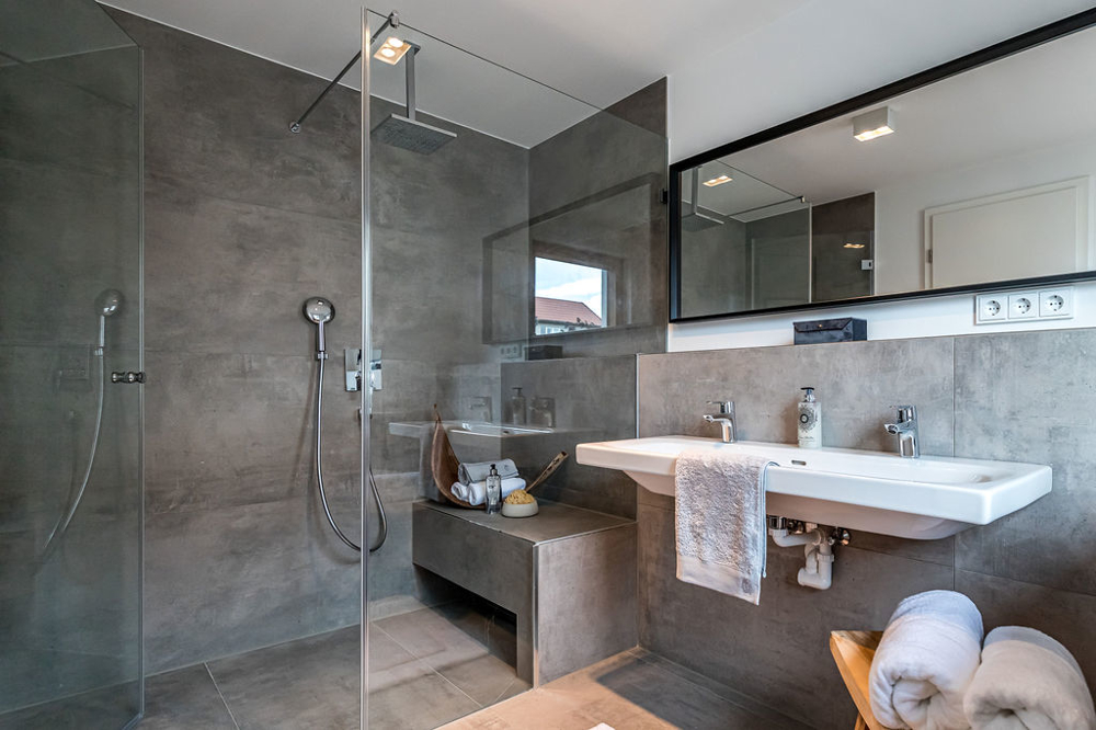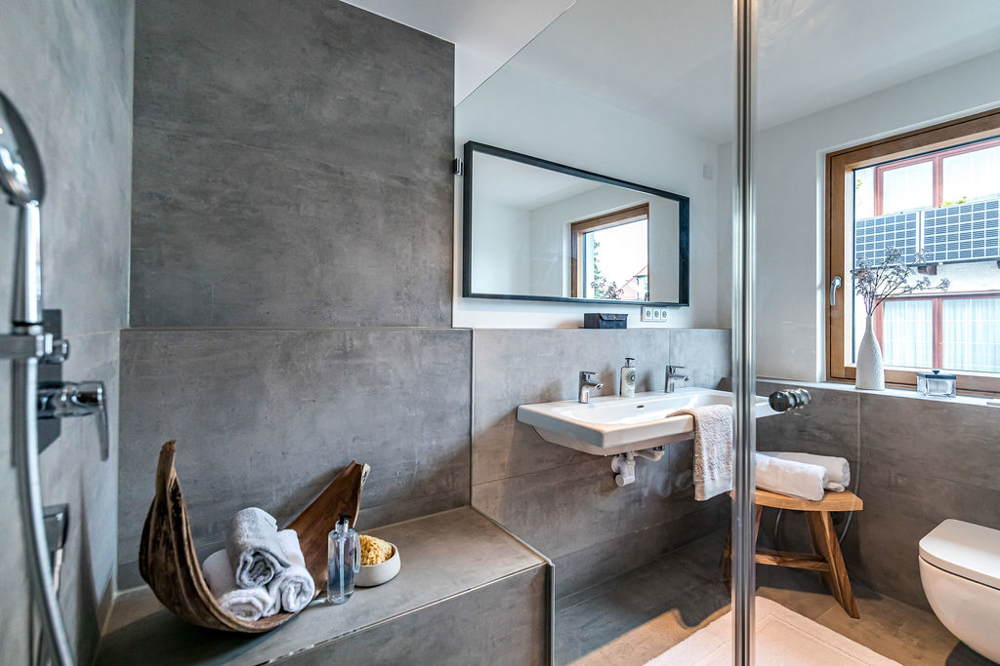 • Exklusive Badausstattung mit Urban grey Fliesen im Format 100 x 100cm von Porcelaingres