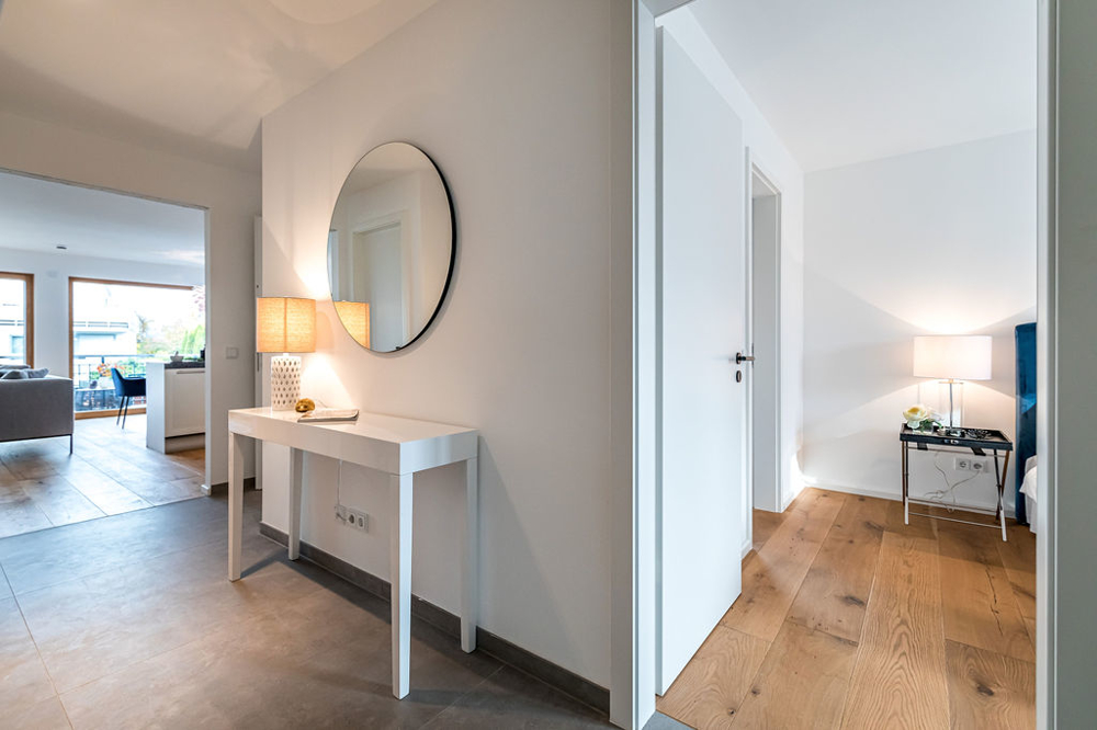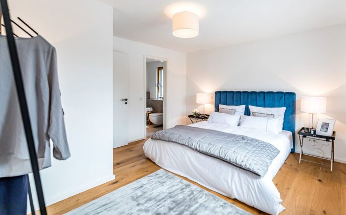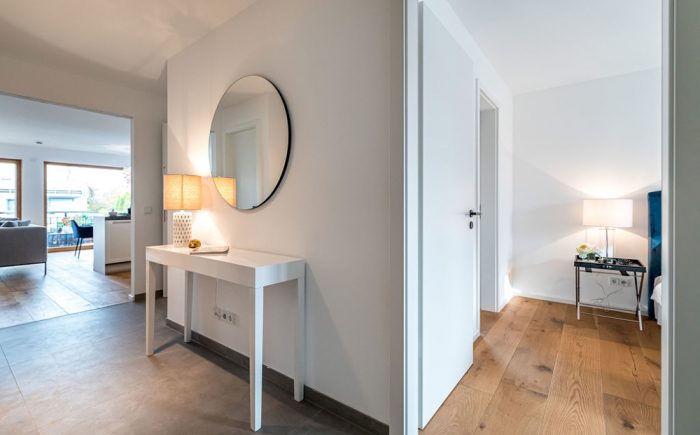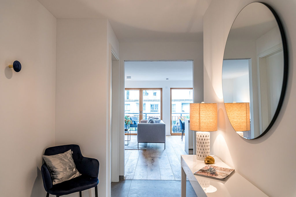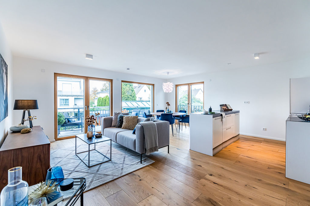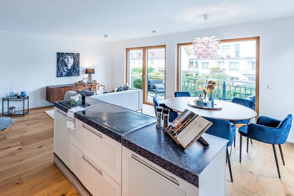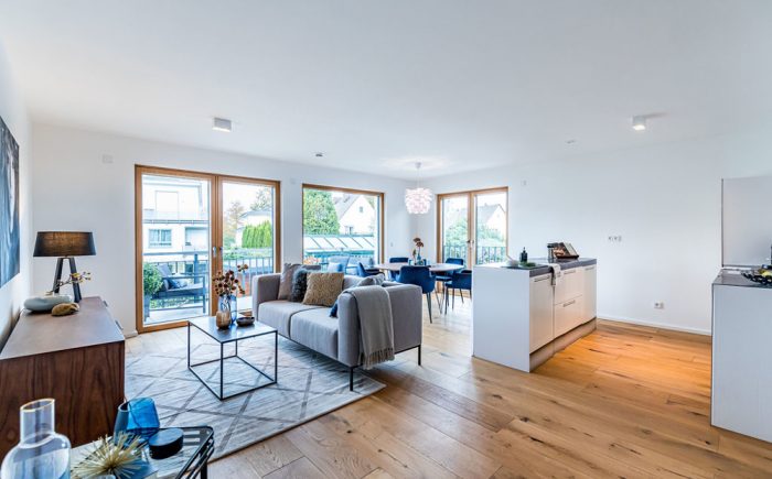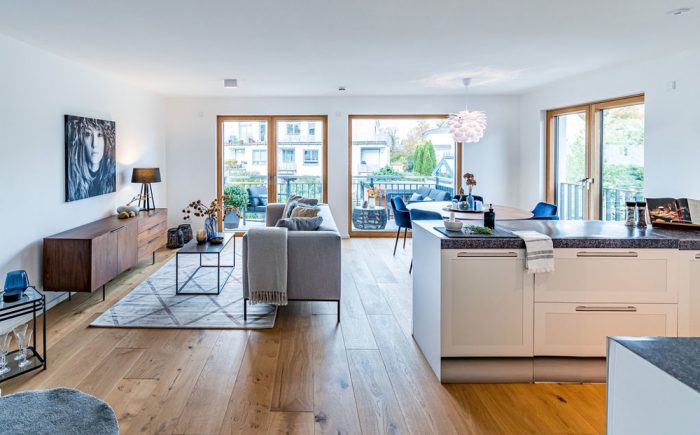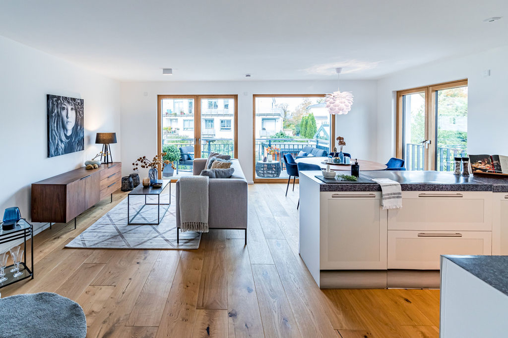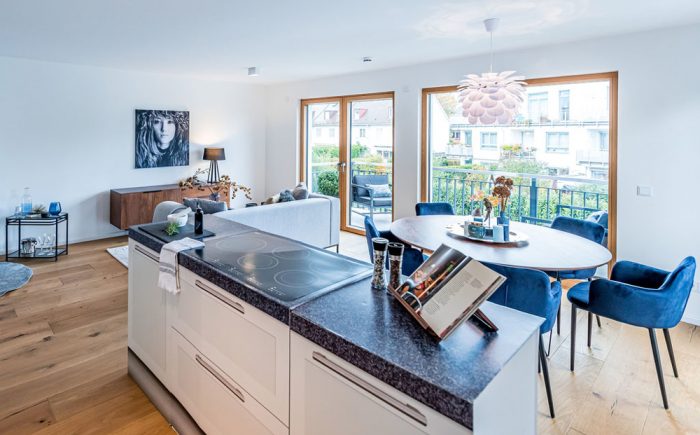 Die großzügige 2-Zimmer-Wohnung im ersten Obergeschoss bietet Ihnen einen weitläufigen offenen Grundriss für eine hohe Wohnqualität. Das Highlight der Wohnung ist der lichtdurchflutete Wohn-Essbereich mit einer offenen Küche. Der anschließende große sonnige Balkon ist nach Westen zum Garten ausgerichtet. Die Räume sind komplett mit französischen Eichendielen ausgelegt. Im Flur bietet verschiedene Einrichtungsmöglichkeiten – auch als kleines Büro. Im Schlafzimmer finden Sie Ihren privaten Bereich mit einem ensuite-Bad und nach Wunsch mit Ankleide.