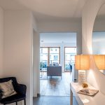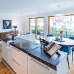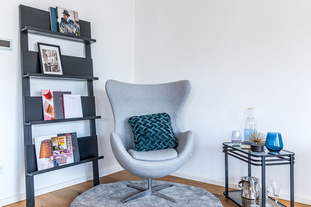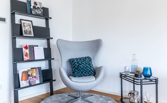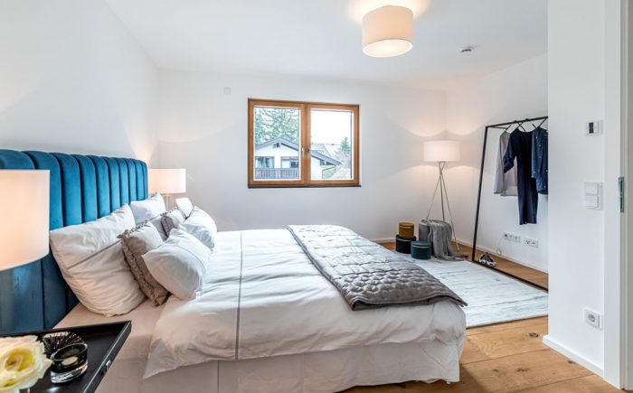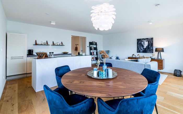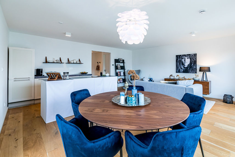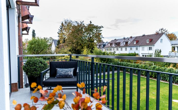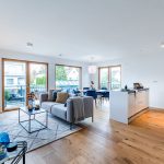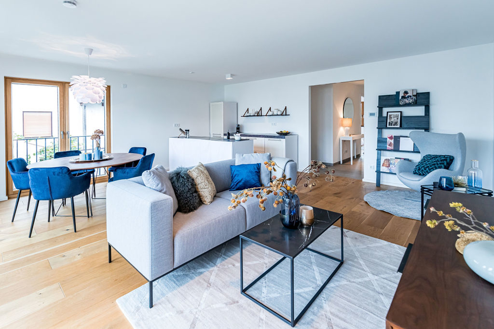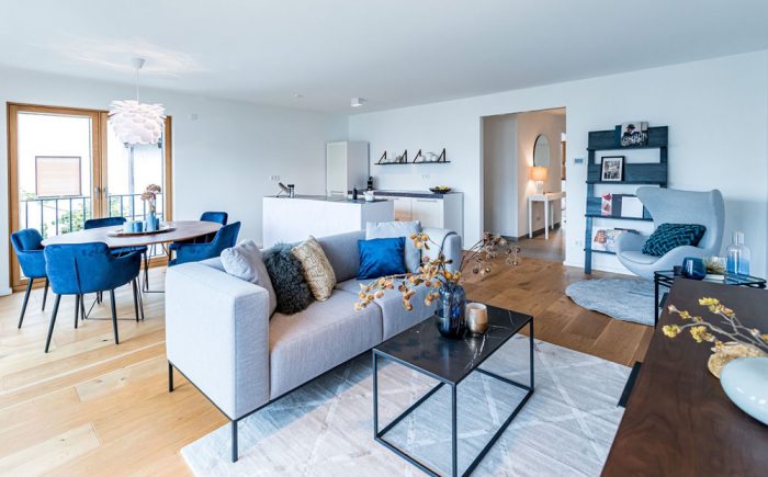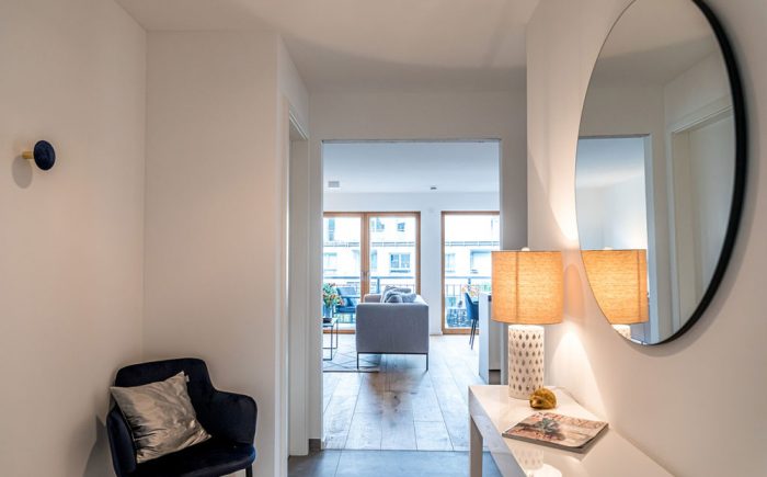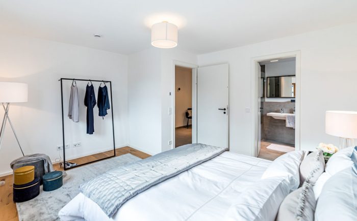 Die großzügige 2-Zimmer-Wohnung im ersten Obergeschoss bietet Ihnen einen weitläufigen offenen Grundriss für eine hohe Wohnqualität. Das Highlight der Wohnung ist der lichtdurchflutete Wohn-Essbereich mit einer offenen Küche. Der anschließende große sonnige Balkon ist nach Westen zum Garten ausgerichtet. Die Räume sind komplett mit französischen Eichendielen ausgelegt. Im Flur bietet verschiedene Einrichtungsmöglichkeiten – auch als kleines Büro. Im Schlafzimmer finden Sie Ihren privaten Bereich mit einem ensuite-Bad und nach Wunsch mit Ankleide.