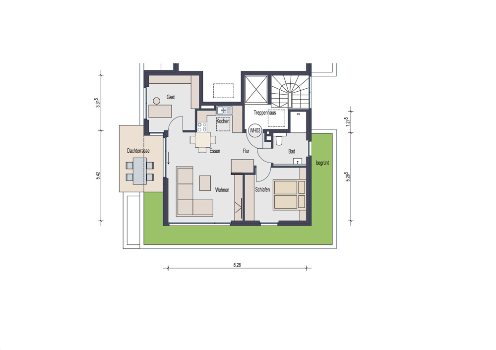 Das im 2. OG gelegene Penthouse ist bequem per Aufzug zu erreichen und besticht durch einen offenen Grundriss und lichtdurchflutete Räume. Von der nach Süden ausgerichteten Dachterrasse können Sie einen herrlichen Blick in die grüne Umgebung genießen. Der Wohn-Essbereich ist mit einer Schreinerküche sowie einem Einbauschrank im Flur ausgestattet. Zum Raumangebot gehören ein Schlafzimmer mit anschließendem Bad sowie ein Arbeits-/Gästezimmer.
