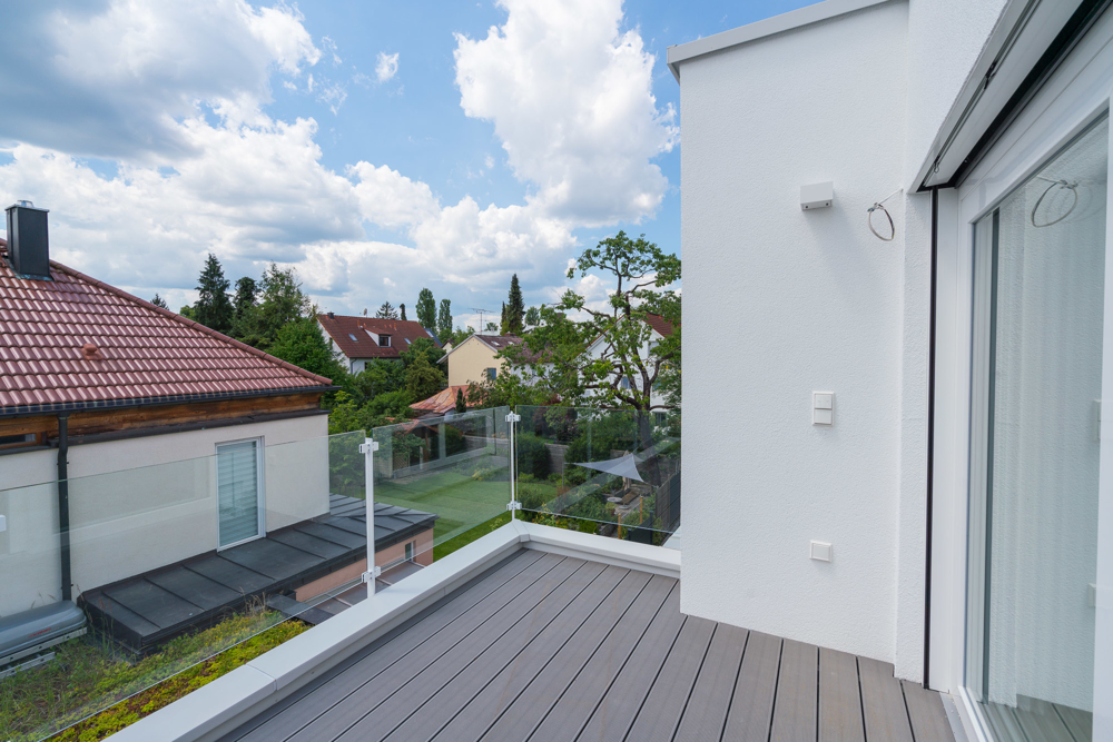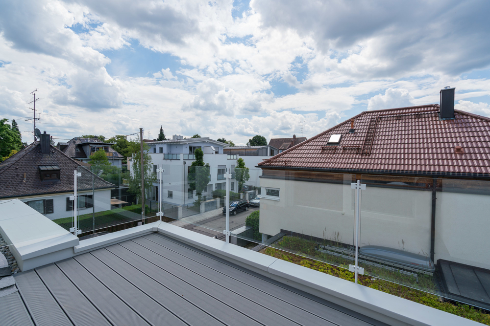 - Süd Dachterrasse ca. 10 m² mit Glas-Brüstungen und PWC-Belag