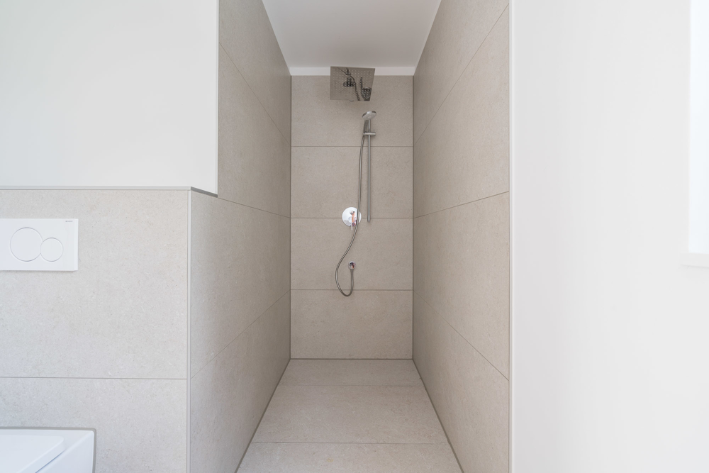 - Großes Bad mit Fenster, großformatigen Feinsteinfliesen von Matteo Thun, Badkeramik und Sanitärgegenstände von Laufen und Ideal-Standard, bodengleiche Walk-In Dusche mit Rain-Shower