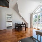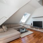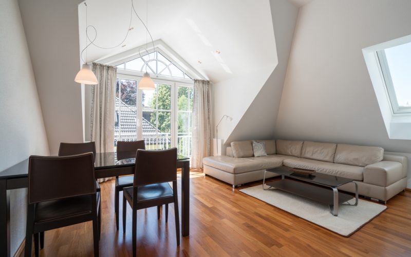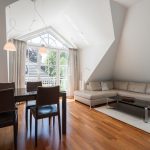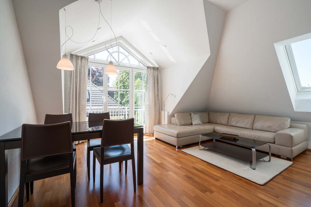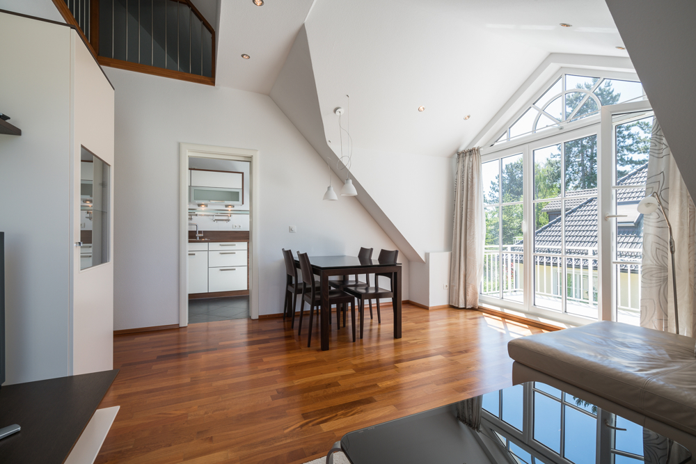 Im Wohn-Essbereich fällt der Blick zu der repräsentativen Fensterfront nach Süden mit dem Austritt zum Balkon. Ein zusätzliches Dachflächenfenster sorgt für Helligkeit von Westen.