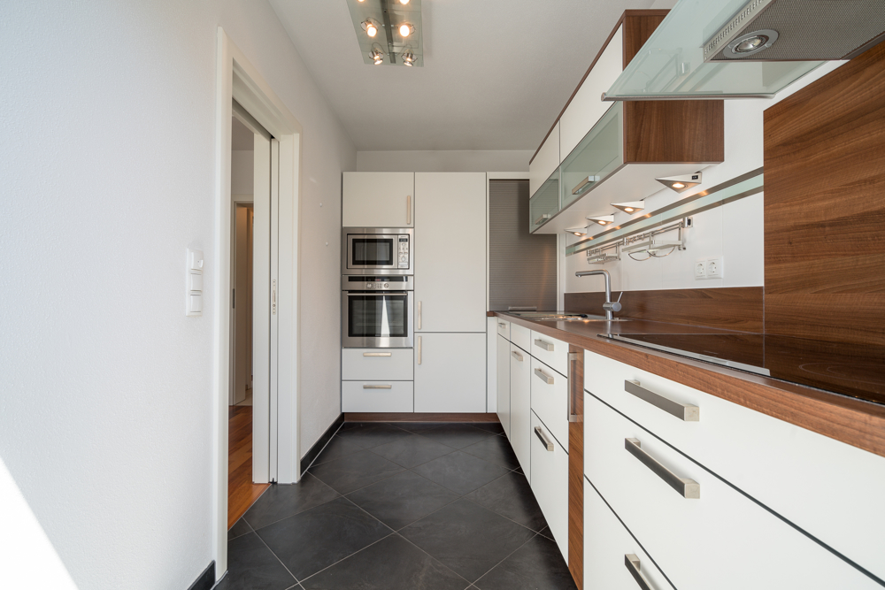 - komplette Einbauküche mit Induktionskochfel, Backofen, Spülmaschine, Mikrowelle, Kühl- und Gefrierkombination