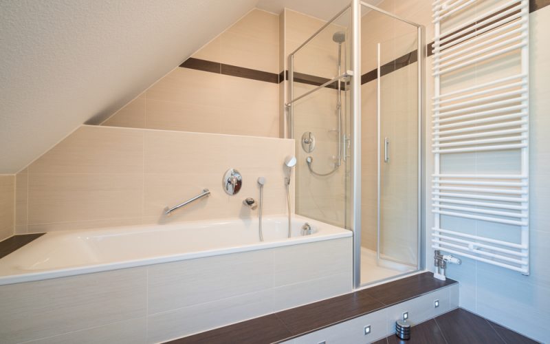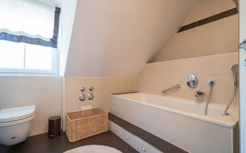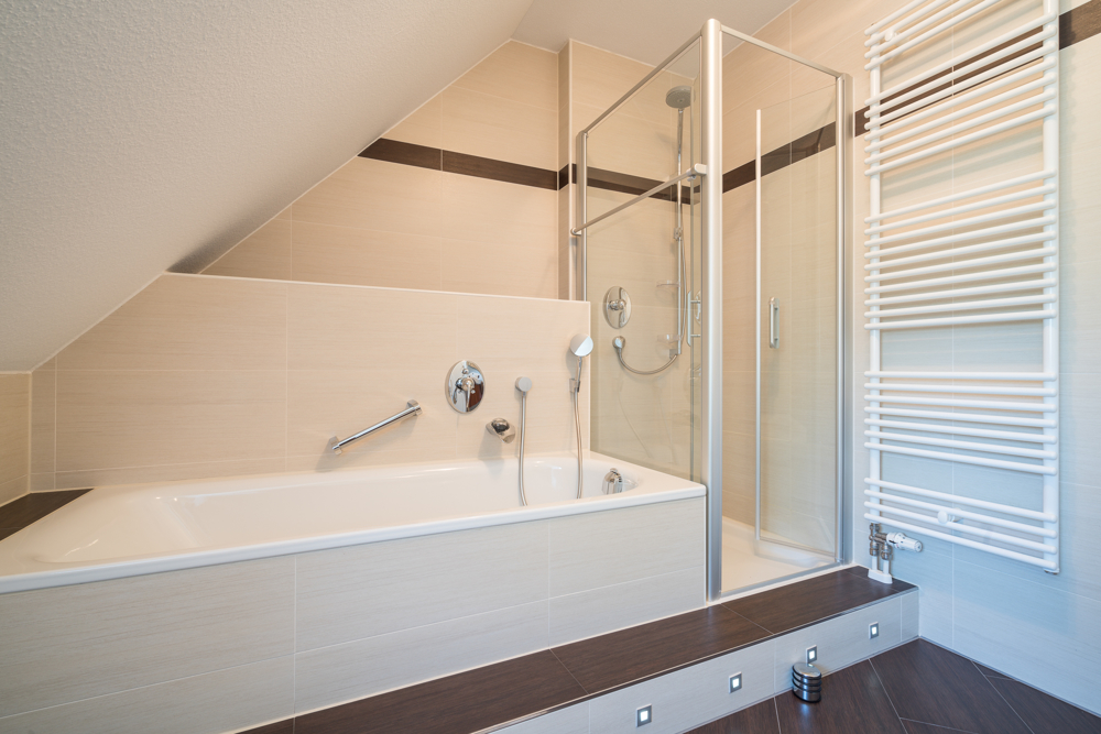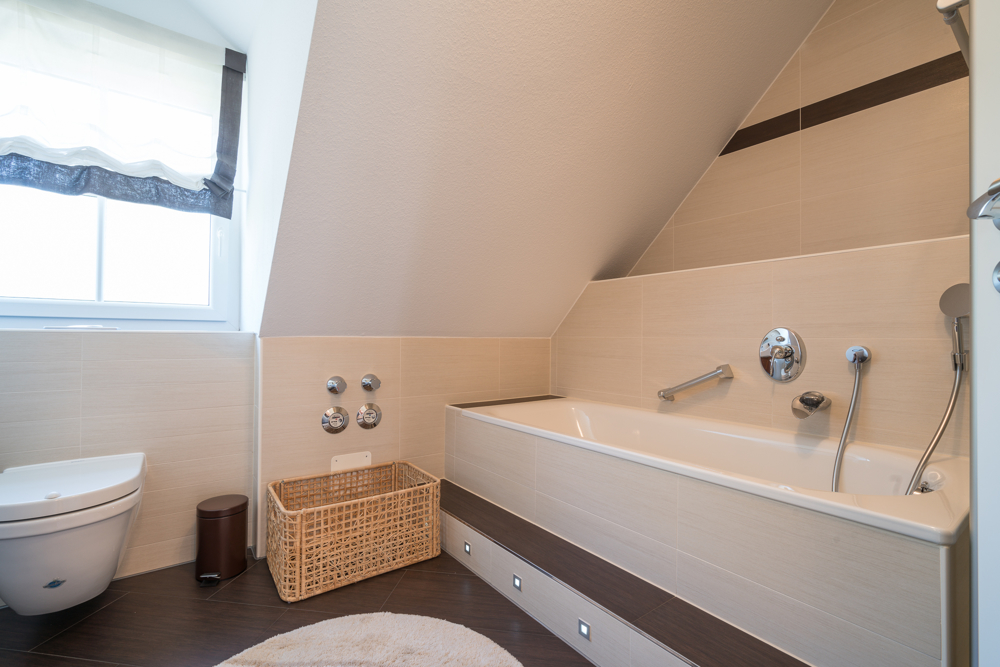 - exklusives Bad in geschmackvoller Fliesenausstattung mit Fenster, Badewanne, Dusche aus Glas, Handtuchheizkörper, Beleuchtung zur Badewanne, geschmackvoller Waschtische und Spiegelschrank
