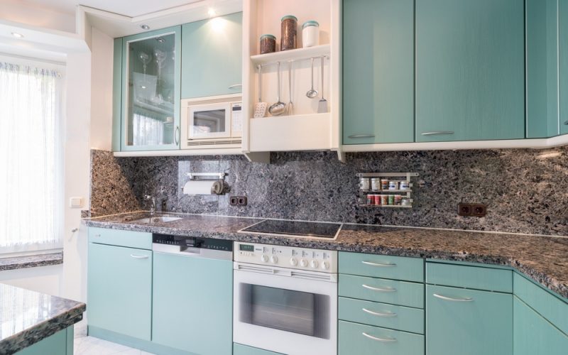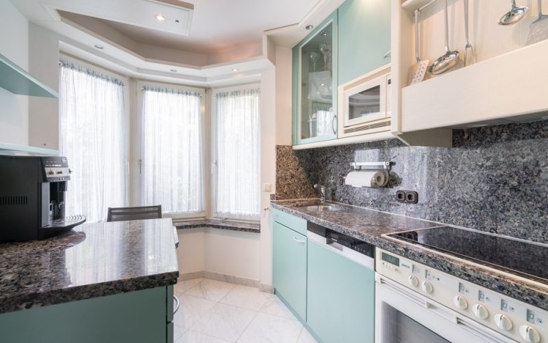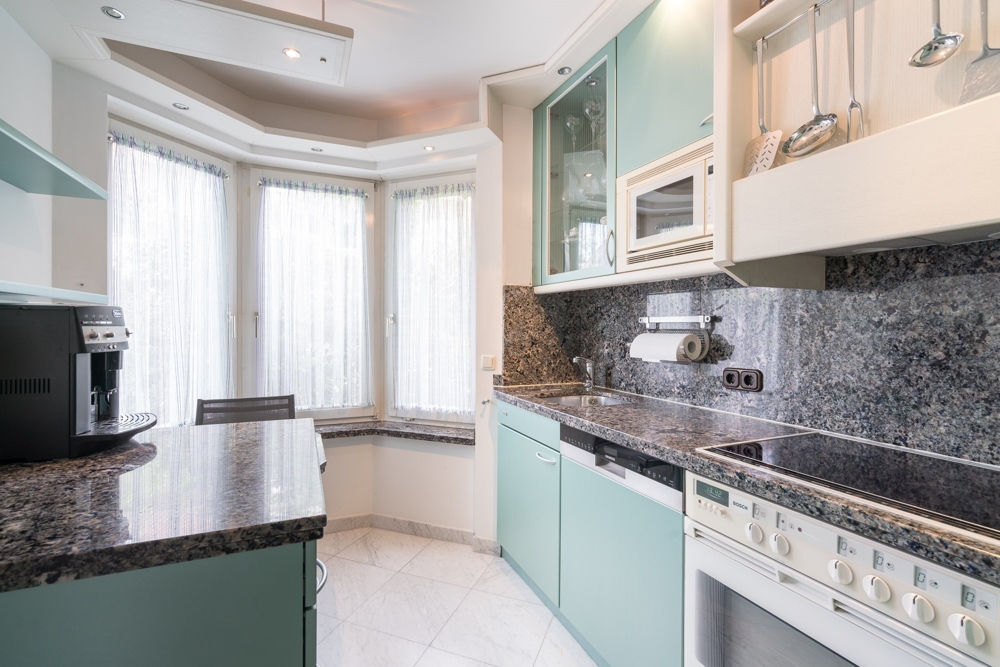 - separate Einbauküche mit Granitarbeitsplatte, Herd mit Cerankochfeld, Spülmaschine, Hochschränken und Essplatz