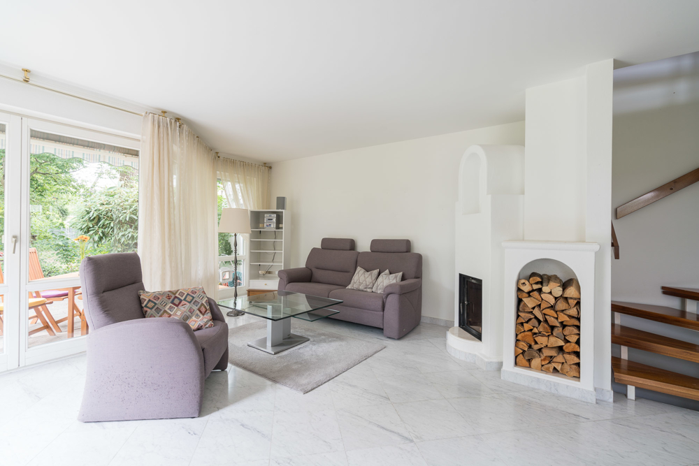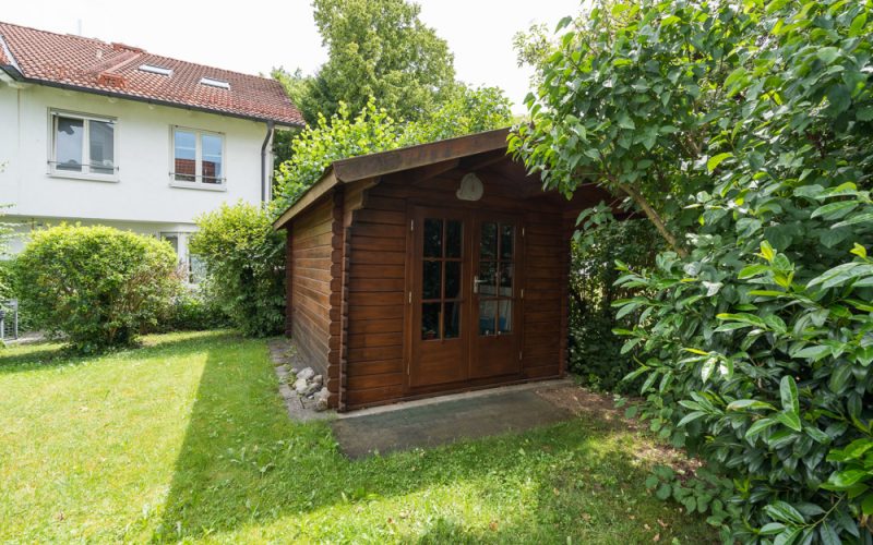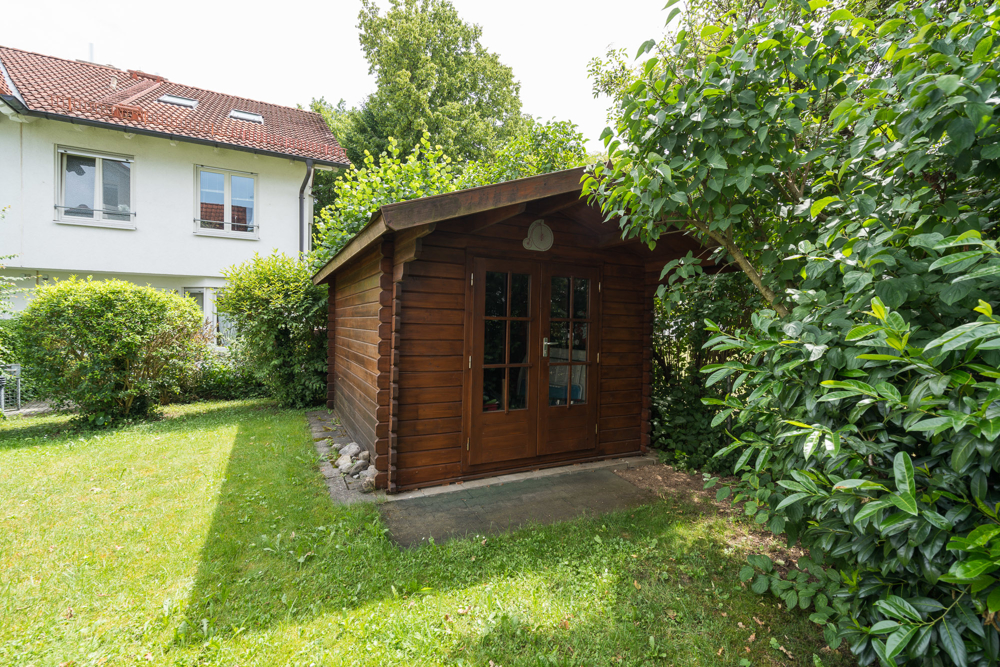 Im Obergeschoss sind zwei große Schlafräume und ein großzügiges Badezimmer mit Dusche und Eck-Badewanne. Das Studio im Dachgeschoss ist sehr hell und bietet mit den hohen Dachschrägen ein großes Platzangebot. Im Untergeschoss gibt es neben einem Heiz- und Vorratsraum einen Hobbyraum mit eingebauter Saune und Dusche. Vom Untergeschoss gelangt man direkt in die Tiefgarage – zu diesem Haus gehört ein ebenerdiger Stellplatz. Der ca. 270 m² große Privatgarten mit Terrasse und Süd-Ostausrichtung ist schön angelegt und bietet viel Platz zum Spielen, Entspannen oder für Hobby-Gärtner.
