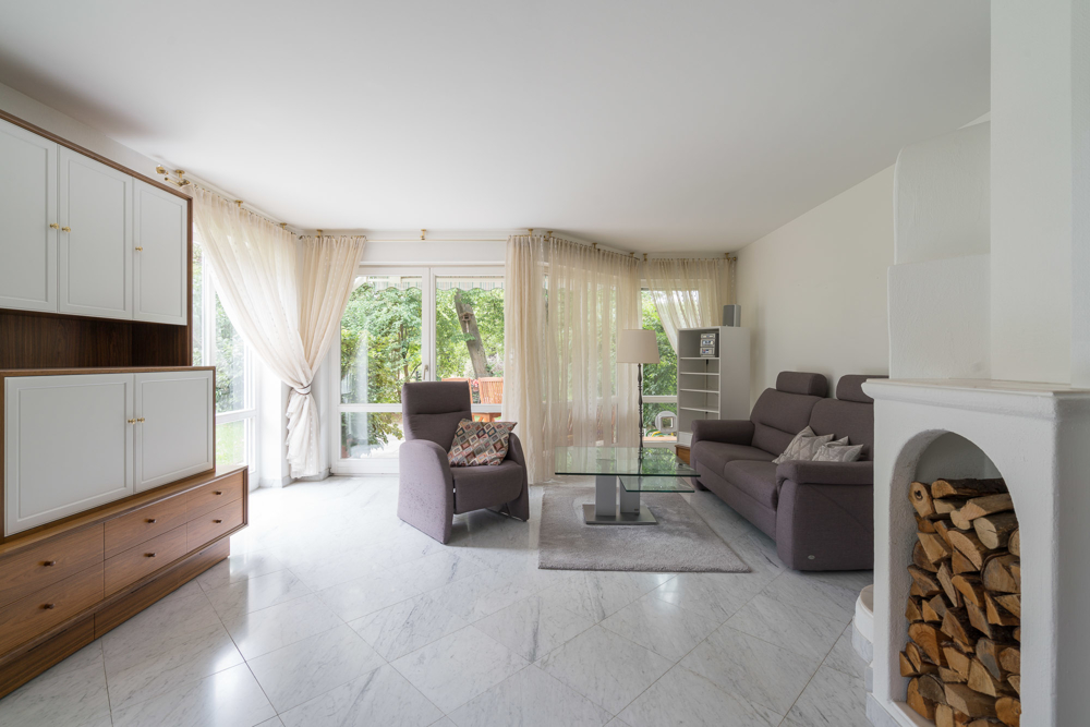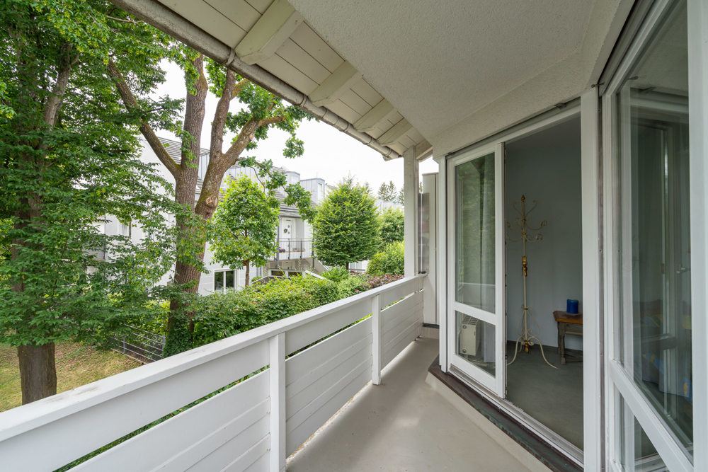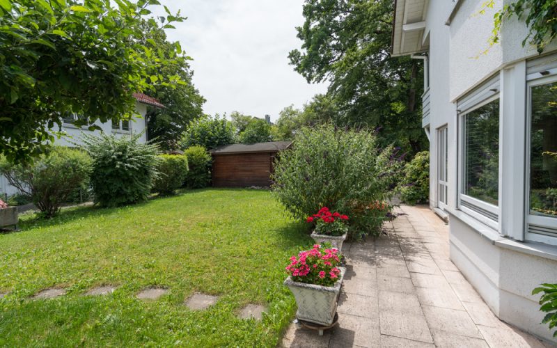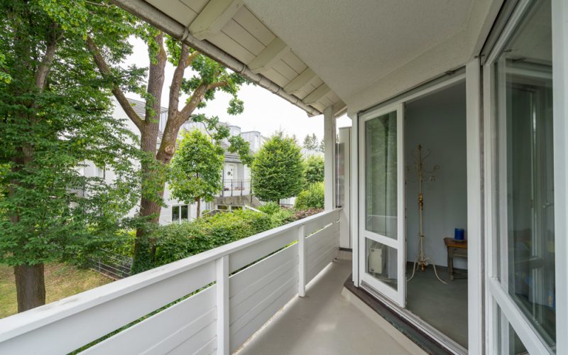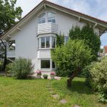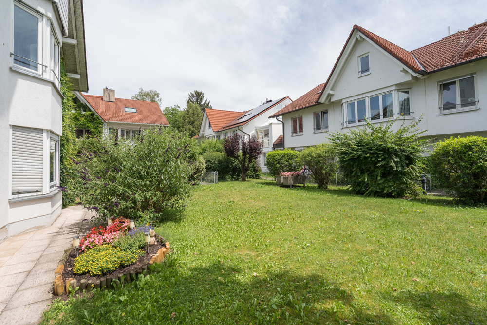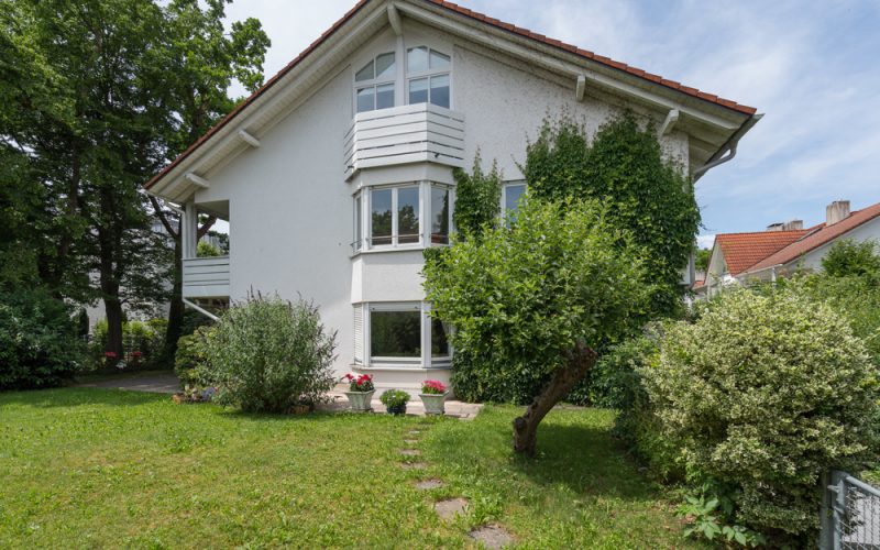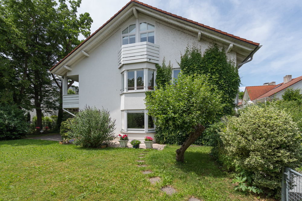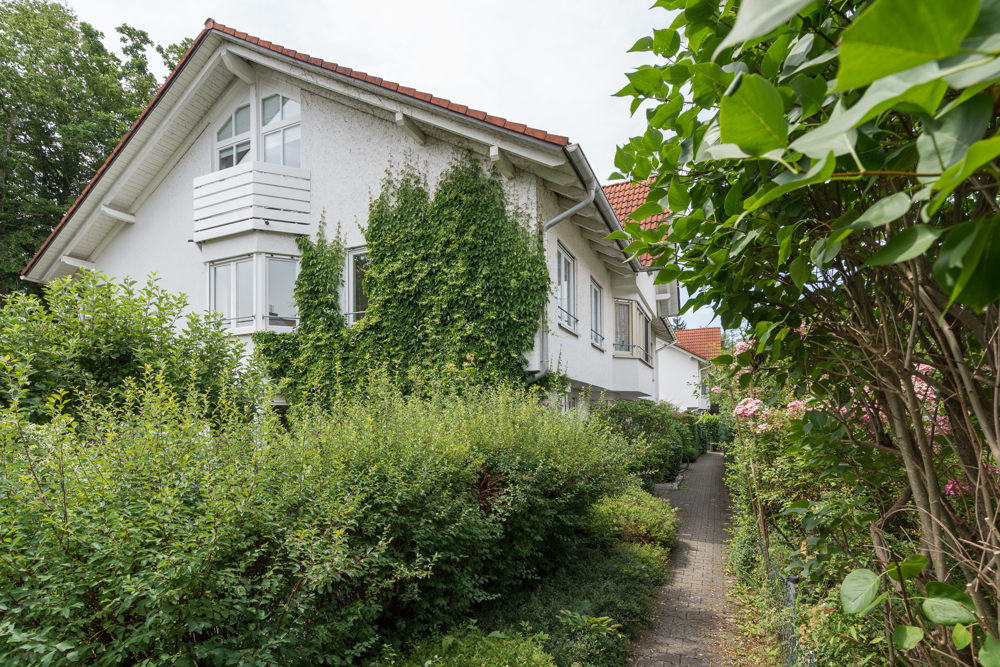 Als ruhige grüne Oase umgeben von Gärten und Bäumen präsentiert sich dieses Eckhaus eines Dreispänners in München-Forstenried. Nur über einen Fußweg von der Straße oder direkt von der Tiefgarage aus ist das Gebäude erreichbar.