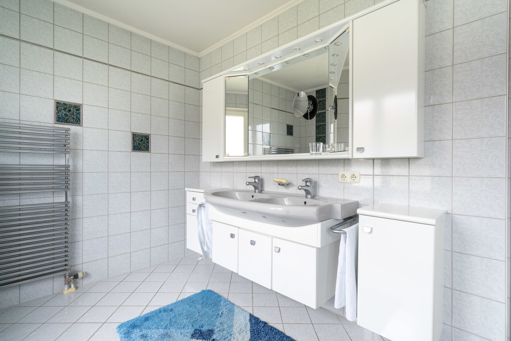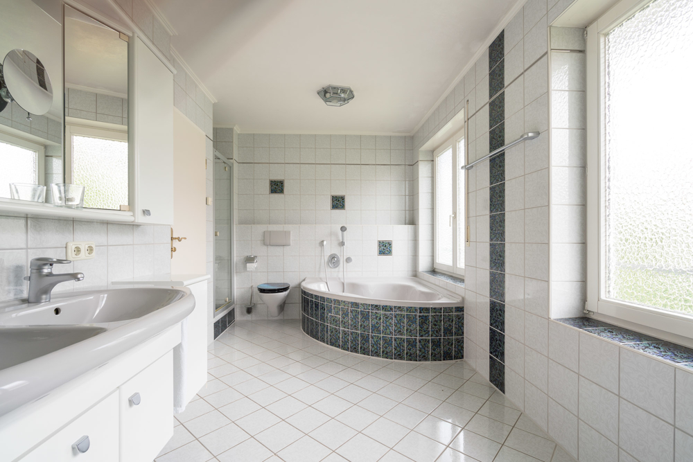 - großzügiges Bad mit Eckbadewanne, Dusche, Doppelwaschtisch, Fußbodenheizung, Handtuchheizkörper und zwei Fenstern