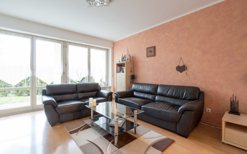Das ca. 20 m² große Wohnzimmer bietet den Zugang zur Terrasse und zum Garten und verfügt über eine durchgehende Fensterfront ins Grüne.