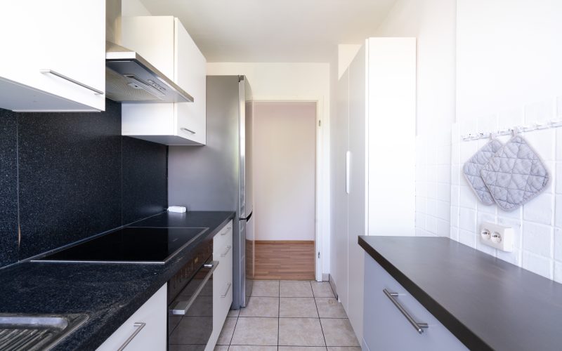 - Küche mit Cerankochfeld, Backofen, Kühlschrank, Spülmaschine und Küchenmöbeln