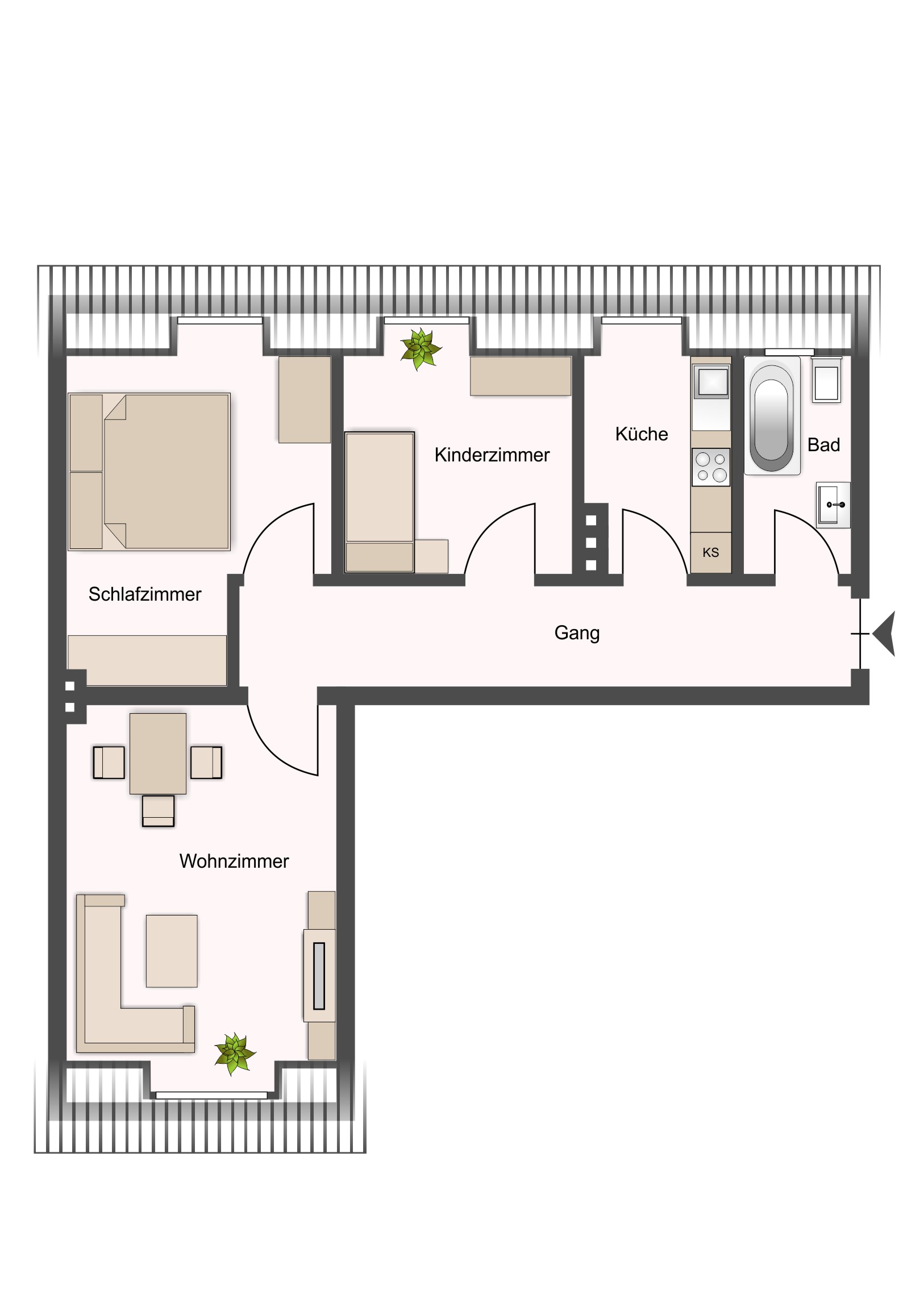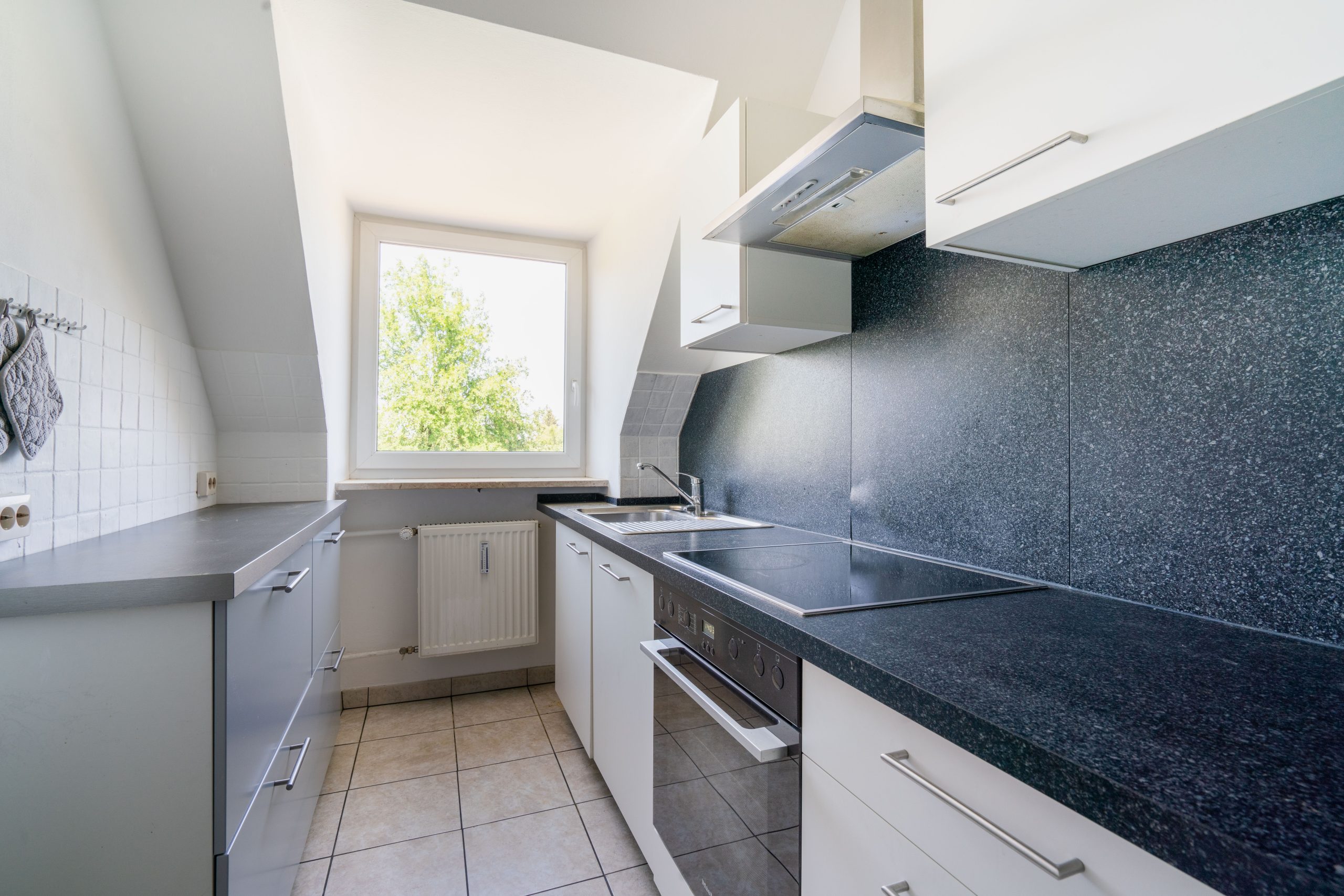 Diese Wohnung im Dachgeschoss besticht mit einem praktischen Grundriss und einer hellen und freundlichen Wohnatmosphäre. Mit einem hohen Kniestock bieten die Räume trotz Dachschrägen gute Einrichtungsmöglichkeiten. Im nach Süden gerichteten Wohnzimmer kann auch der Essplatz eingerichtet werden. Die Küche ist ein eigener Raum und mit der kompletten Einrichtung im Kaufpreis enthalten. Zwei ansprechende Zimmer können zum Schlafen, Arbeiten oder als Kinderzimmer genutzt werden. Der Flur verbindet alle Räume miteinander.