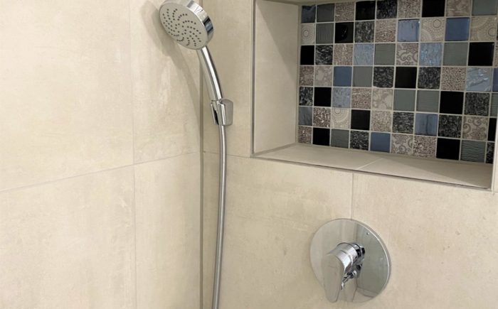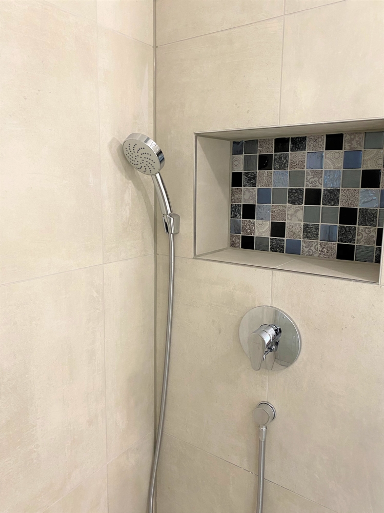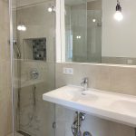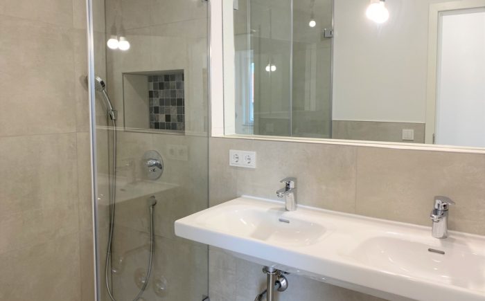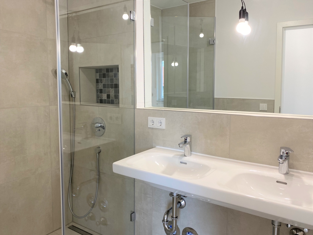 – geräumiges Bad mit großformatigen Fliesen, Doppelwaschbecken und Wandspiegel, Handtuchheizkörper, bodengleiche Dusche mit „Rainshower“ und hübscher Mosaikablage