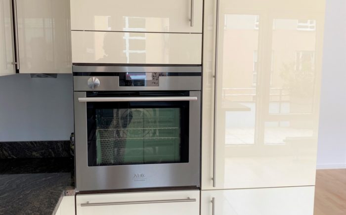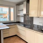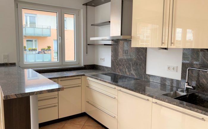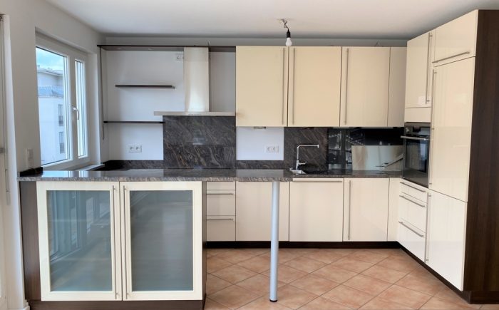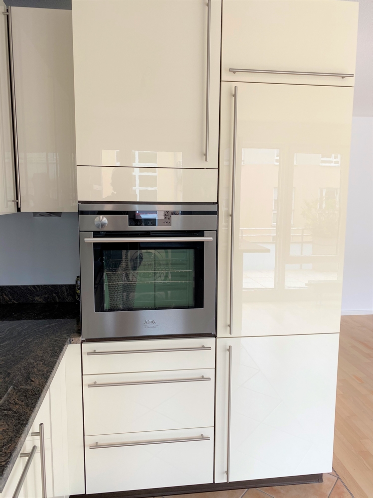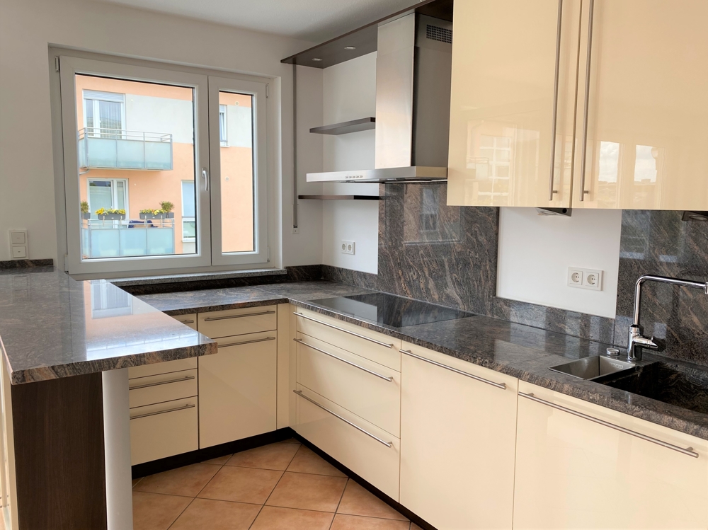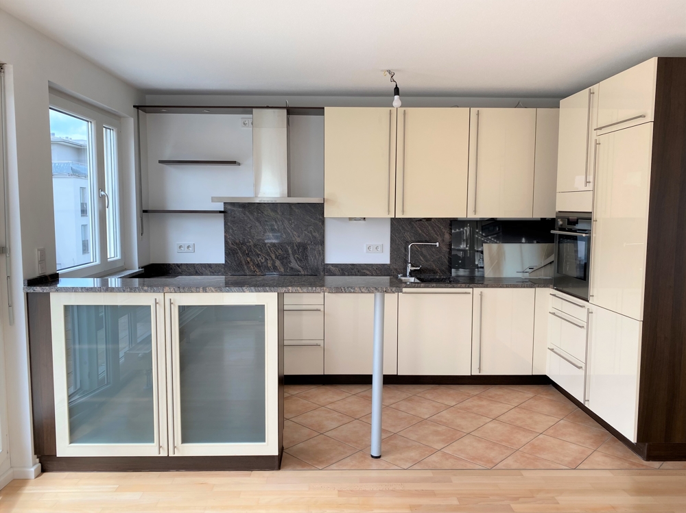 – hochwertige Einbauküche in cremeweiß hochglanz mit Granitarbeitsplatte, übergroßes Cerankochfeld, Backofen in Arbeitshöhe, Kühlschrank mit Gefrierkombination, Einbauschränken und offene Theke