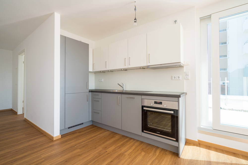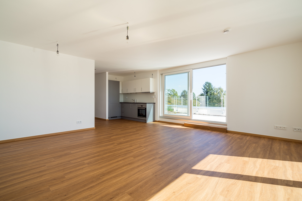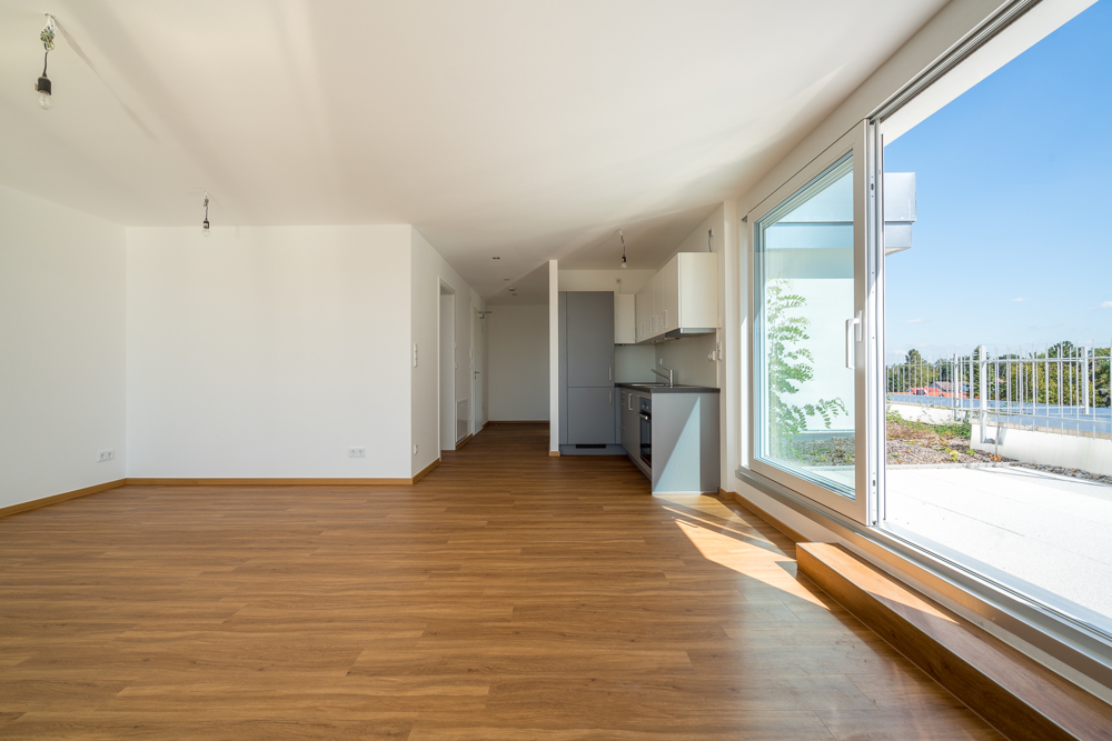 An den großzügigen offenen Wohn-Essbereich schließt eine komplette Einbauküche an, die Böden sind mit hochwertigen Vinyl ausgelegt. Große bodentiefe Fenster im Wohn-Essbereich und der Zugang zur Dachterrasse vermitteln eine sonnige Atmosphäre – auch im Bad sorgt eine elektrische Lichtkuppel für Tageslicht.