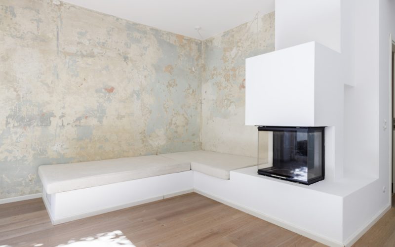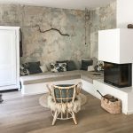 Die dekorative Ausstrahlung der Wände im Wohnbereich stammt noch aus der Zeit der Ladennutzung und fügt sich wunderbar in den Loftstil ein. Bei der Materialwahl haben sich die Eigentümer für Räuchereiche, Zementfliesen und Altholz entschieden und dazu mit vielen Details den Look der Wohnung komplettiert.