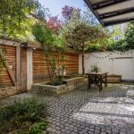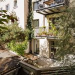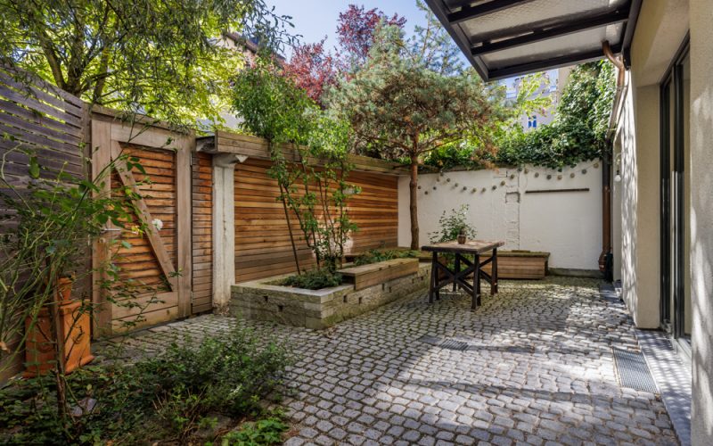 Der ca. 35 m² große Innenhof wurde von einem Gartenarchitekten angelegt und mit ausgesuchten Pflanzen begrünt. Die gemauerten Hochbeete bieten mit der Holzverkleidung eine lässige Sitzgelegenheit im Schatten eines Pinienbaums – ein Juwel in der Großstadt.