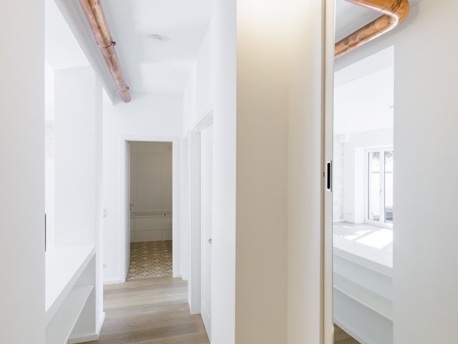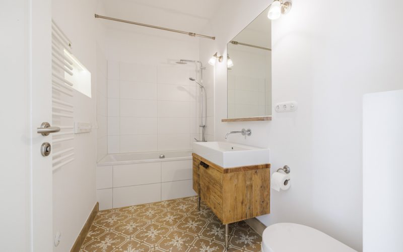 Das Bad ist an den Wänden weiß gefliest und mit einer Badewanne und einem Waschtisch mit Unterschrank aus Altholz dem Einrichtungsstil angepasst. Die beiden Schlafräume lassen sich unterschiedlich nutzen – bei einem Raum wurde die Türe mit Doppelflügeln zum Wohnraum ausgestattet um auch hier Durchblicke zu erzeugen.