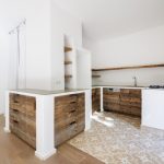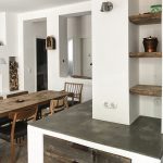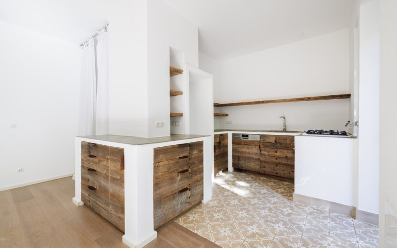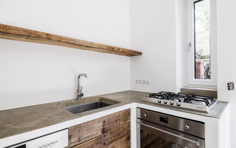 Auch bei der Küche wurde das Stilkonzept beibehalten: gemauerte Küchenzeilen bilden die Basis, in die Schubladen, Schränke und Regalböden aus Altholz eingebaut wurden. Eine Besonderheit ist die Arbeitsplatte aus Betonspachteltechnik. Hierzu passen Elektrogeräte von Smeg und sogar ein Gas-Kochfeld für Hobby-Köche. Am Boden wurden die ansprechenden Zementfliesen verlegt, die auch im Bad verwendet wurden.