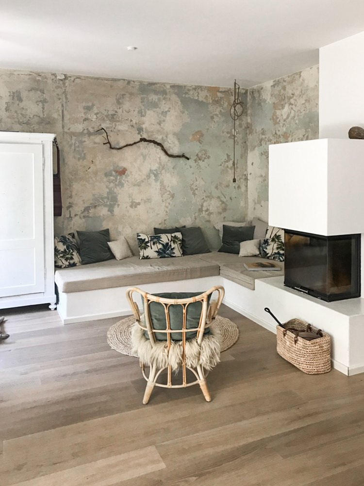Die dekorative Ausstrahlung der Wände im Wohnbereich stammt noch aus der Zeit der Ladennutzung und fügt sich wunderbar in den Loftstil ein. Bei der Materialwahl haben sich die Eigentümer für Räuchereiche, Zementfliesen und Altholz entschieden und dazu mit vielen Details den Look der Wohnung komplettiert.