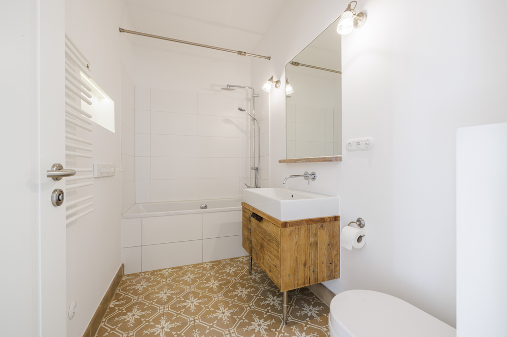 Das Bad ist an den Wänden weiß gefliest und mit einer Badewanne und einem Waschtisch mit Unterschrank aus Altholz dem Einrichtungsstil angepasst. Die beiden Schlafräume lassen sich unterschiedlich nutzen – bei einem Raum wurde die Türe mit Doppelflügeln zum Wohnraum ausgestattet um auch hier Durchblicke zu erzeugen.