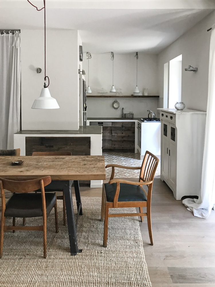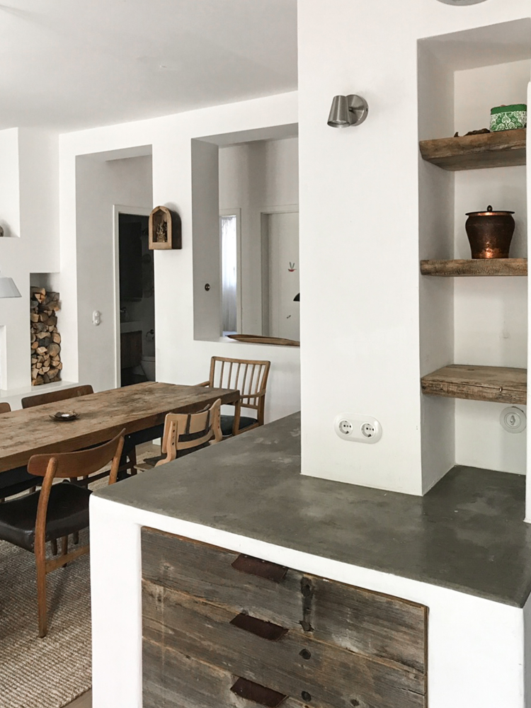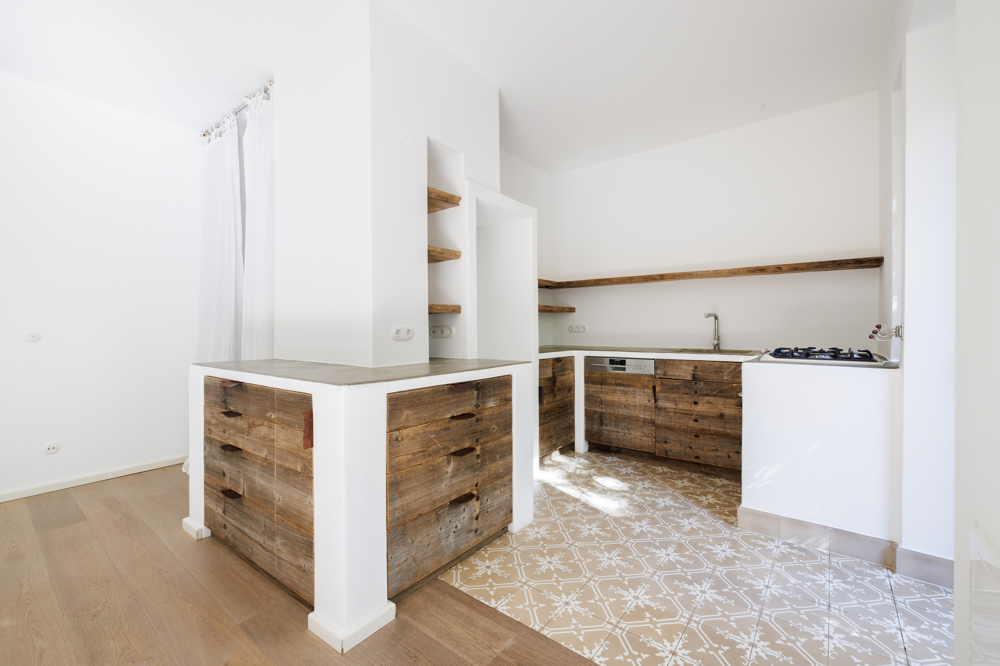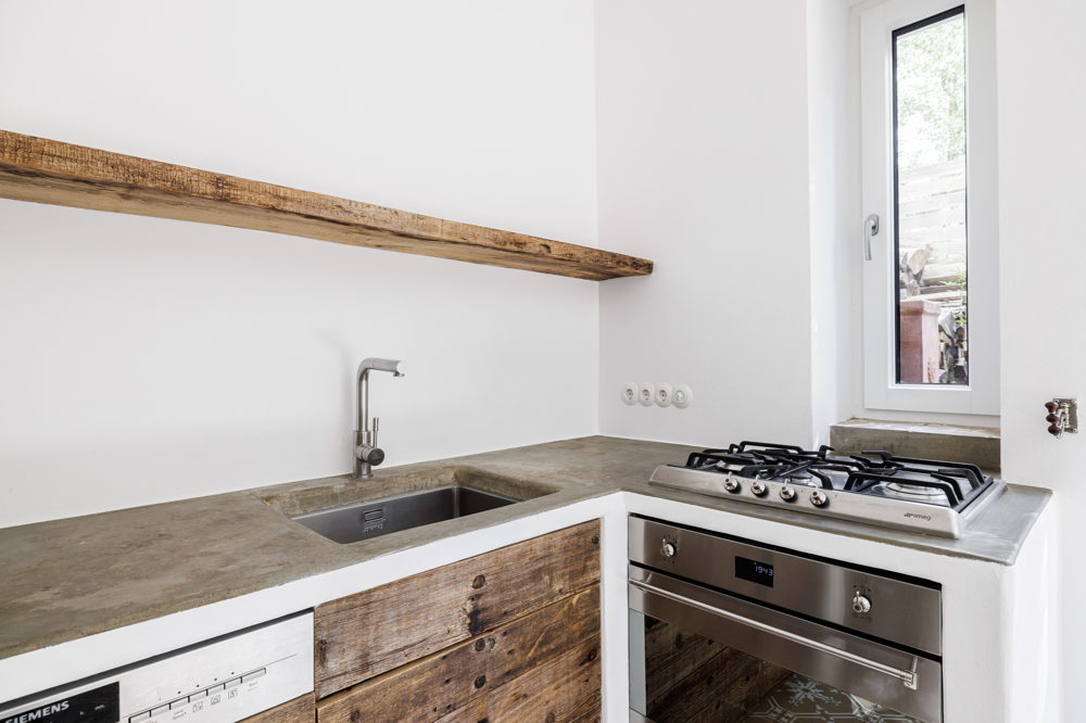 Auch bei der Küche wurde das Stilkonzept beibehalten: gemauerte Küchenzeilen bilden die Basis, in die Schubladen, Schränke und Regalböden aus Altholz eingebaut wurden. Eine Besonderheit ist die Arbeitsplatte aus Betonspachteltechnik. Hierzu passen Elektrogeräte von Smeg und sogar ein Gas-Kochfeld für Hobby-Köche. Am Boden wurden die ansprechenden Zementfliesen verlegt, die auch im Bad verwendet wurden.