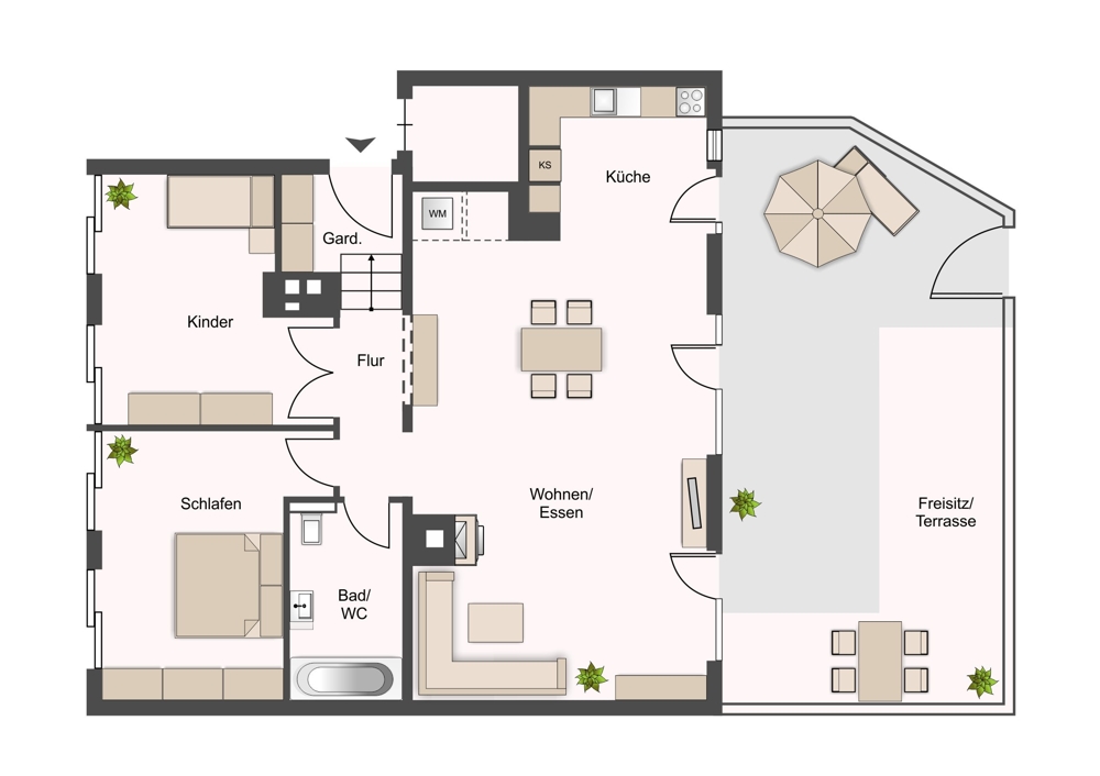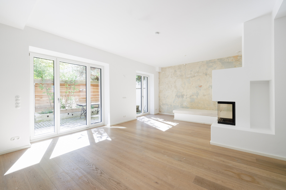 Das Herzstück der Wohnung bildet der großzügige Wohnbereich mit Fenstertüren zum Gartenhof. Wenn diese im Sommer geöffnet sind entsteht eine wunderbare Verbindung nach draußen.