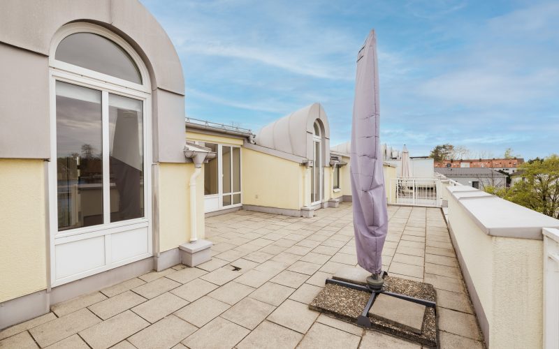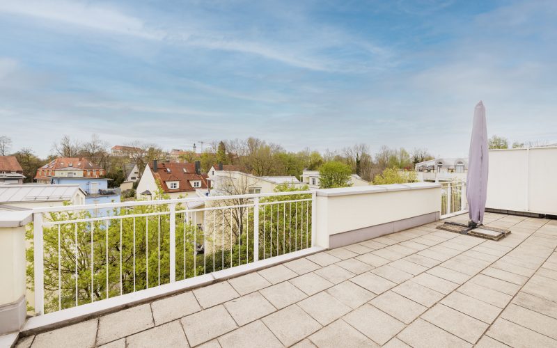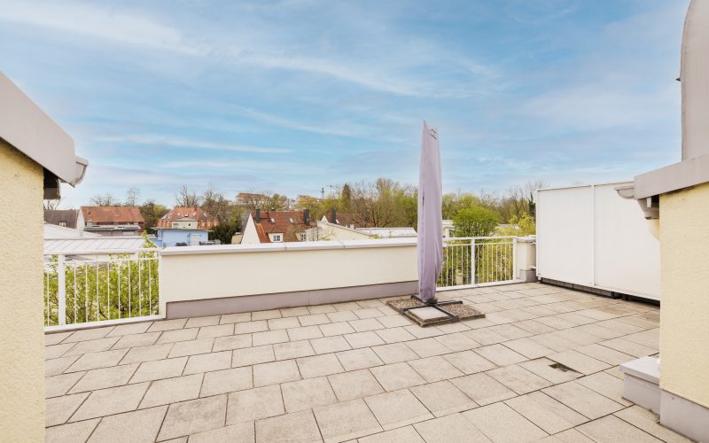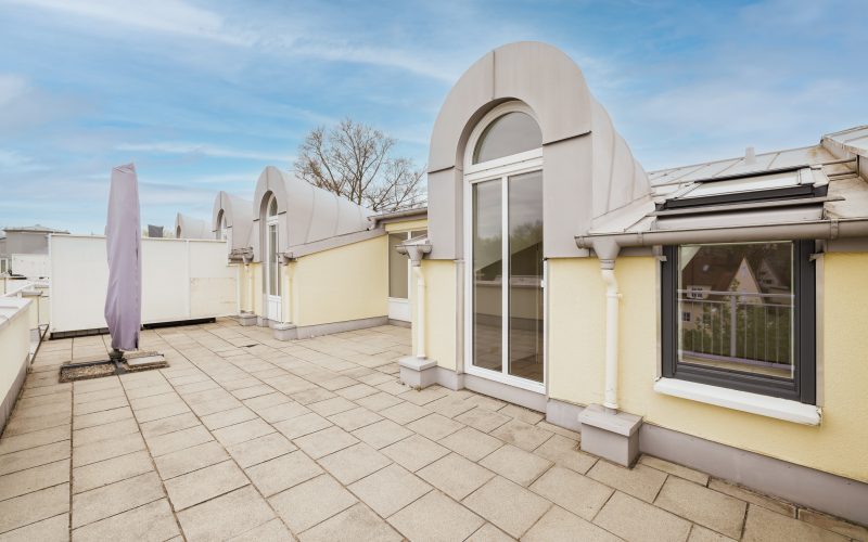 Ein architektonisches Highlight ist die ca. 36 m² große Dachterrasse mit Westausrichtung. Von hier aus eröffnet sich Ihnen ein malerischer Blick über die Altstadt von Dachau bis hin zum Schloss. Die Fläche bietet vielfältige Gestaltungsmöglichkeiten – ob Lounge-Bereich, Pflanzenparadies oder Outdoor-Essplatz: Hier verwirklichen Sie Ihre persönlichen Terrassenträume.