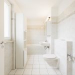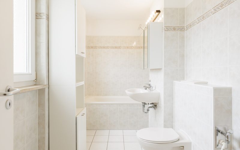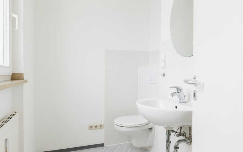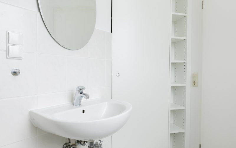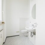- Bad im Wohngeschoss deckenhoch gefliest mit WC und Waschbecken