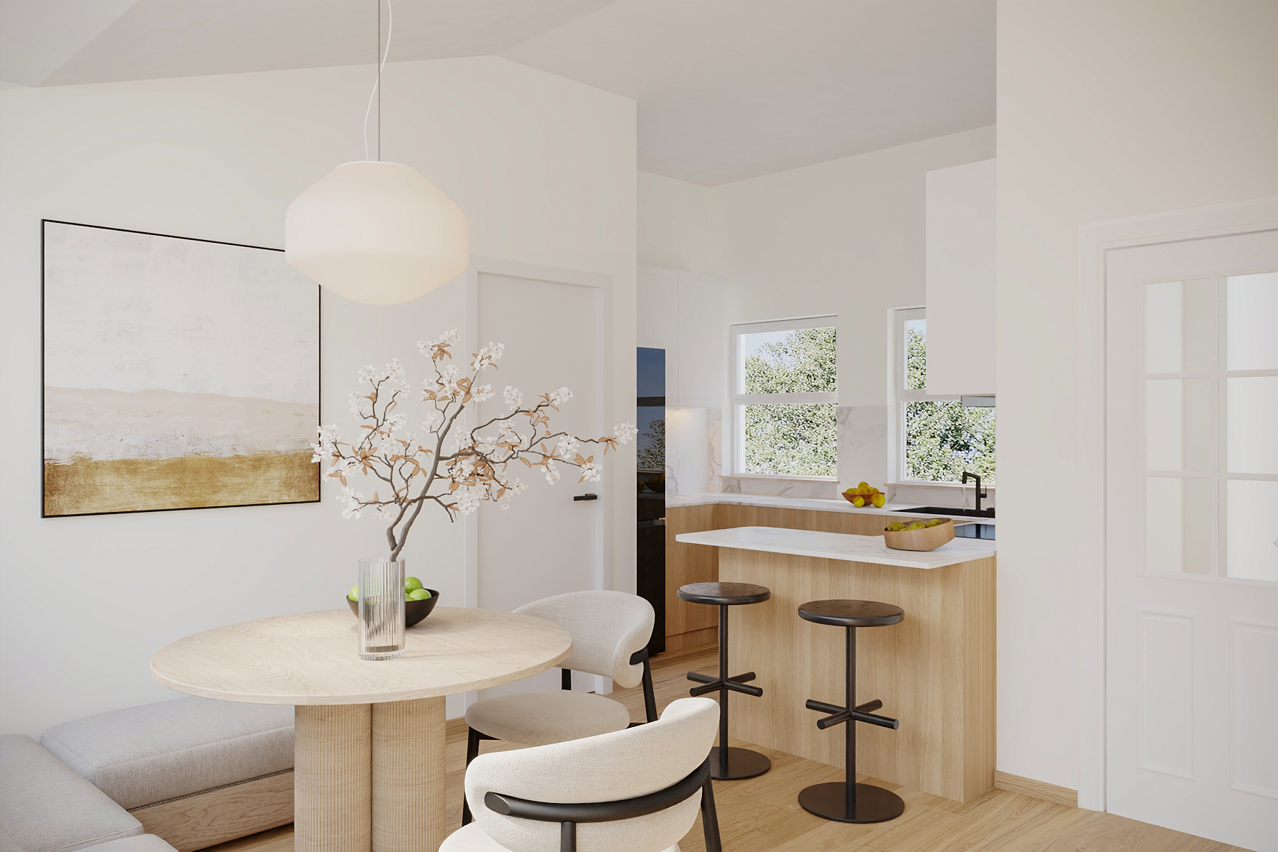 Ein Türdurchgang trennt den Eingangsbereich vom großzügigen Wohnbereich. Dieser gliedert sich in ein etwa 24 m² großes Wohnzimmer mit gemütlicher Dachschräge und charmanten Dachgaubenfenstern sowie ein rund 12 m² großes Esszimmer mit bodentiefen Fenstern, die viel natürliches Licht hereinlassen. Die Küche schließt sich direkt an das Esszimmer an und bietet ausreichend Platz für eine funktionale und moderne Küchenlösung. Ein weiterer Raum auf dieser Ebene eignet sich ideal als Arbeitszimmer, Gäste- oder Kinderzimmer – flexibel je nach Ihren Bedürfnissen.