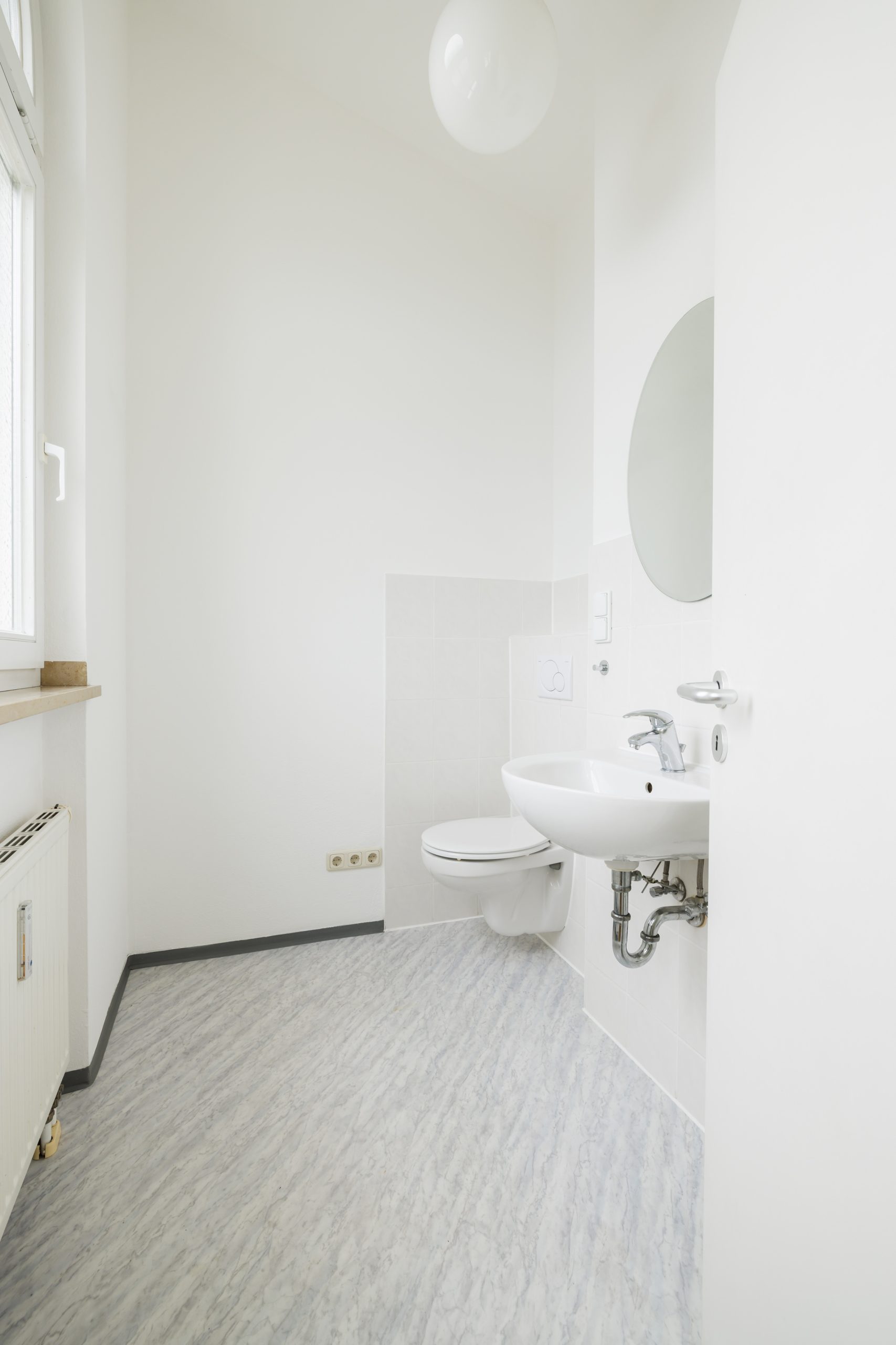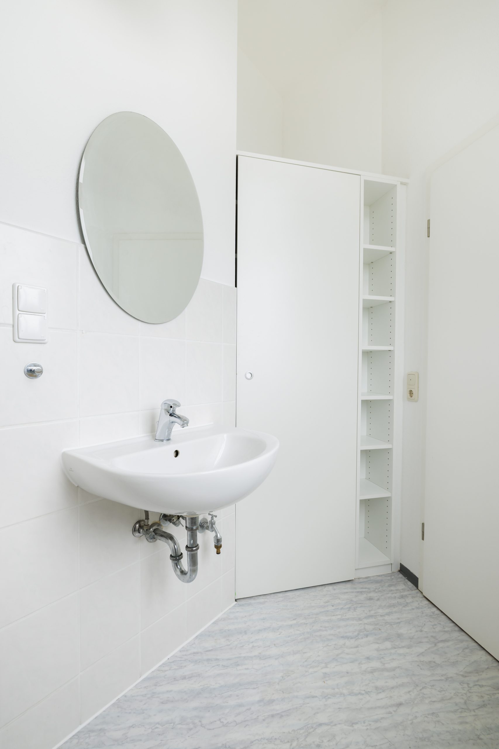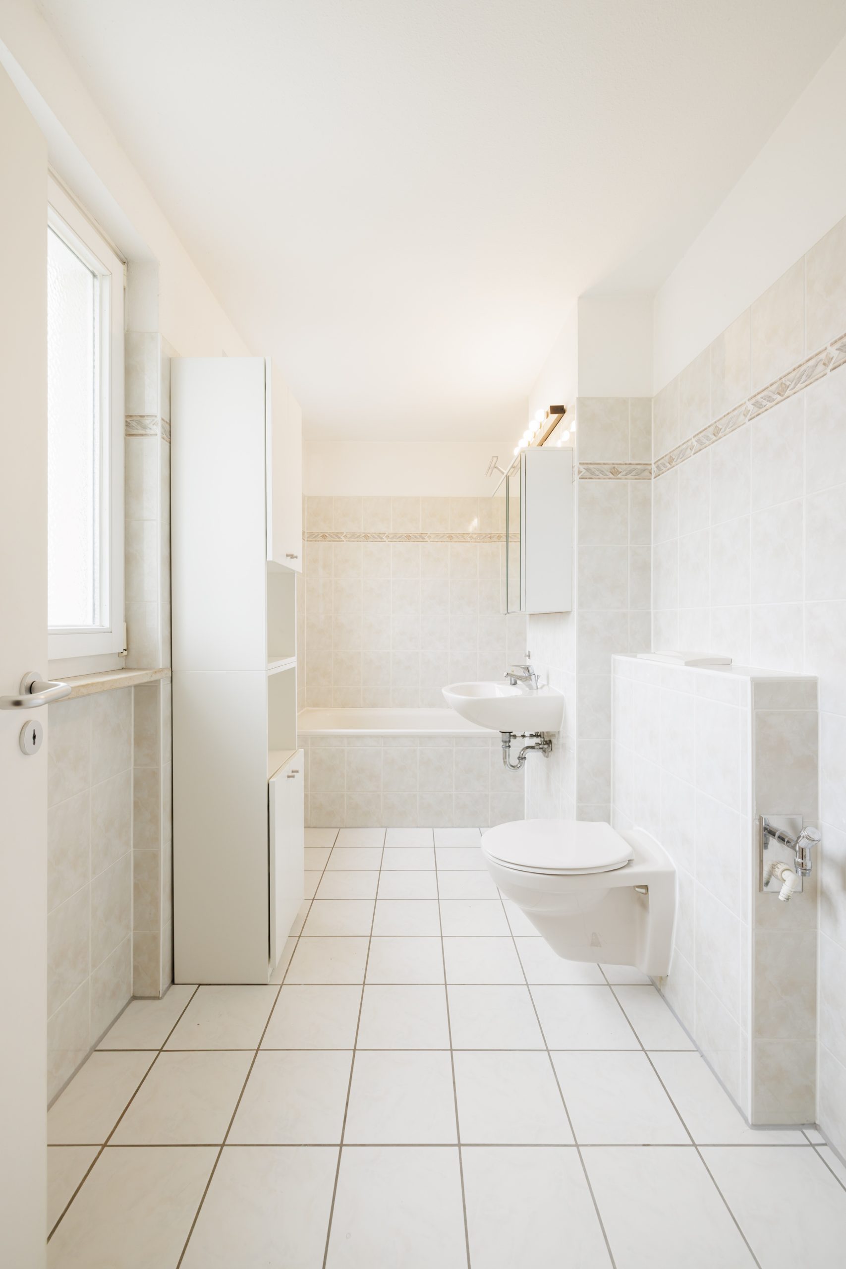 - Bad im Wohngeschoss deckenhoch gefliest mit WC und Waschbecken