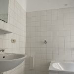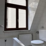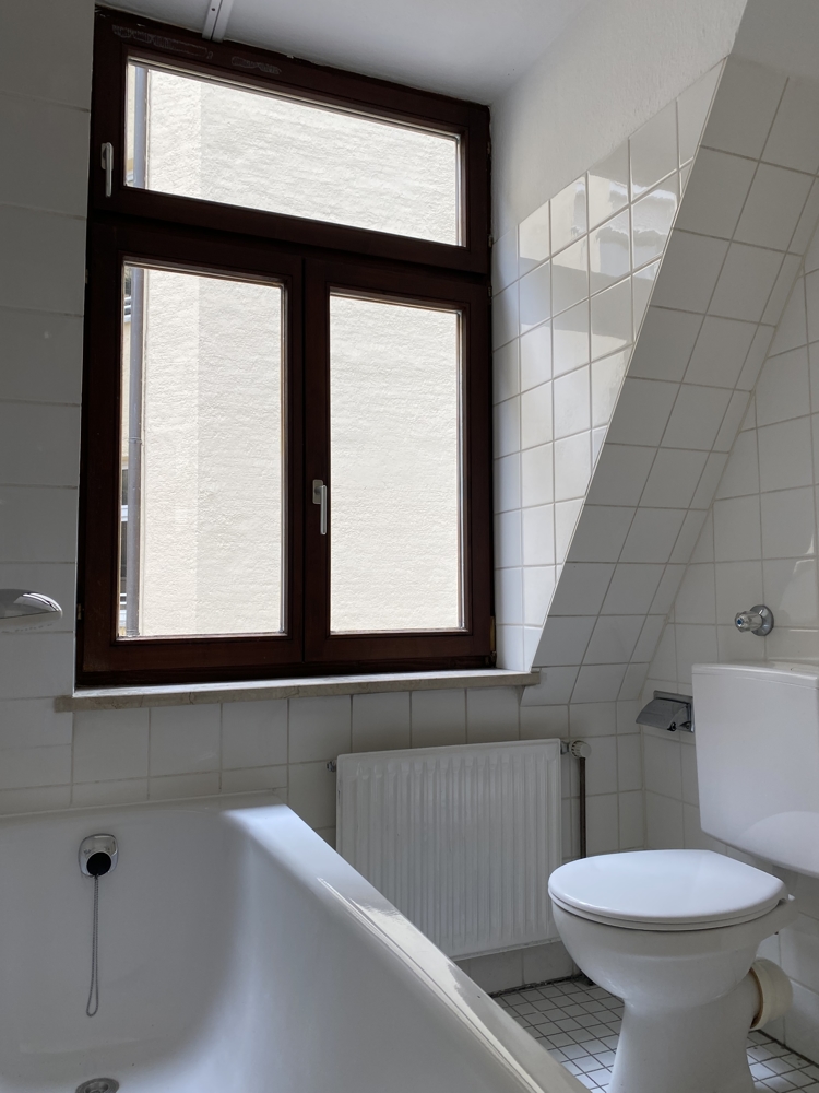 - Bad in weiß mit Badewanne, WC, Waschbecken und Fenster