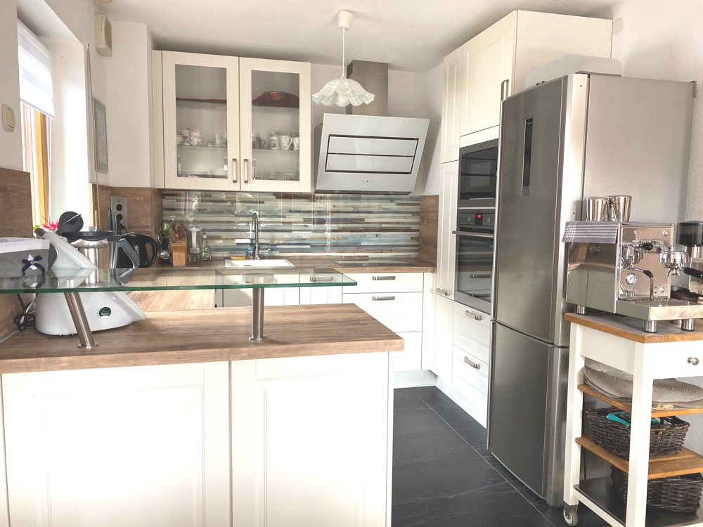 – schicke Einbauküche mit Induktionsherd, Dunstabzugshaube, Backofen und Mikrowelle in Arbeitshöhe, Spülmaschine – alle Geräte von AEG (Kühlschrank mieterseits)