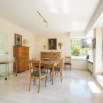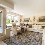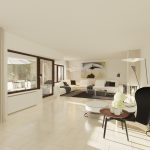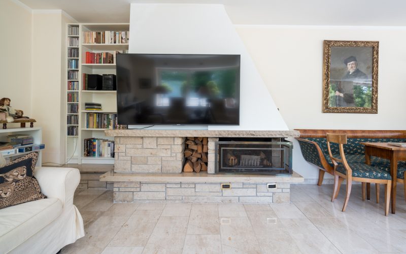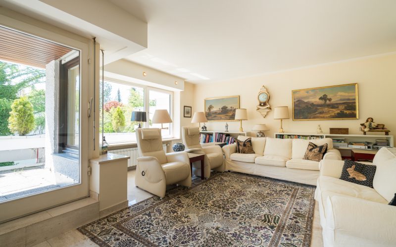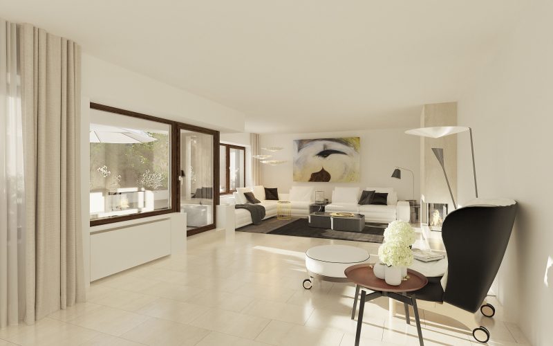 Die gesamte Wohnung ist schwellenlos mit cremeweißem Marmor ausgelegt und vermittelt eine lichtdurchflutete, helle Wohnatmosphäre. Der fast 60 m² große Wohn-Essbereich erstreckt sich über die ganze Südseite und bietet durch die große Fensterfront auch bei trübem Wetter viel Licht. Vor dem offenen Kamin, der sich in das Gesamtbild einpasst, können Sie behagliche Stunden verbringen.