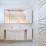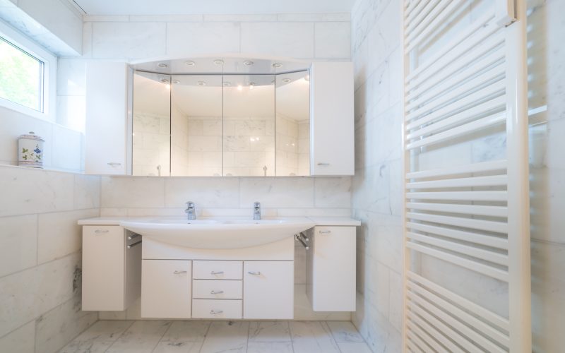 – geräumiges Bad komplett in weißem Marmor gestaltet mit Fenstern, Doppelwaschtisch, Badewanne, Dusche, WC und Bidet sowie Handtuchheizkörper