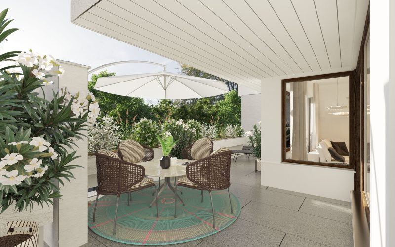 – Dachterrasse: Markise, Wasseranschluss, Beleuchtung und Steckdosen, Pflanztröge mit Bewässerungssystem