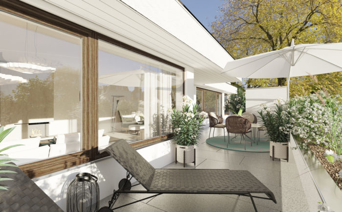 – Dachterrasse: Markise, Wasseranschluss, Beleuchtung und Steckdosen, Pflanztröge mit Bewässerungssystem
