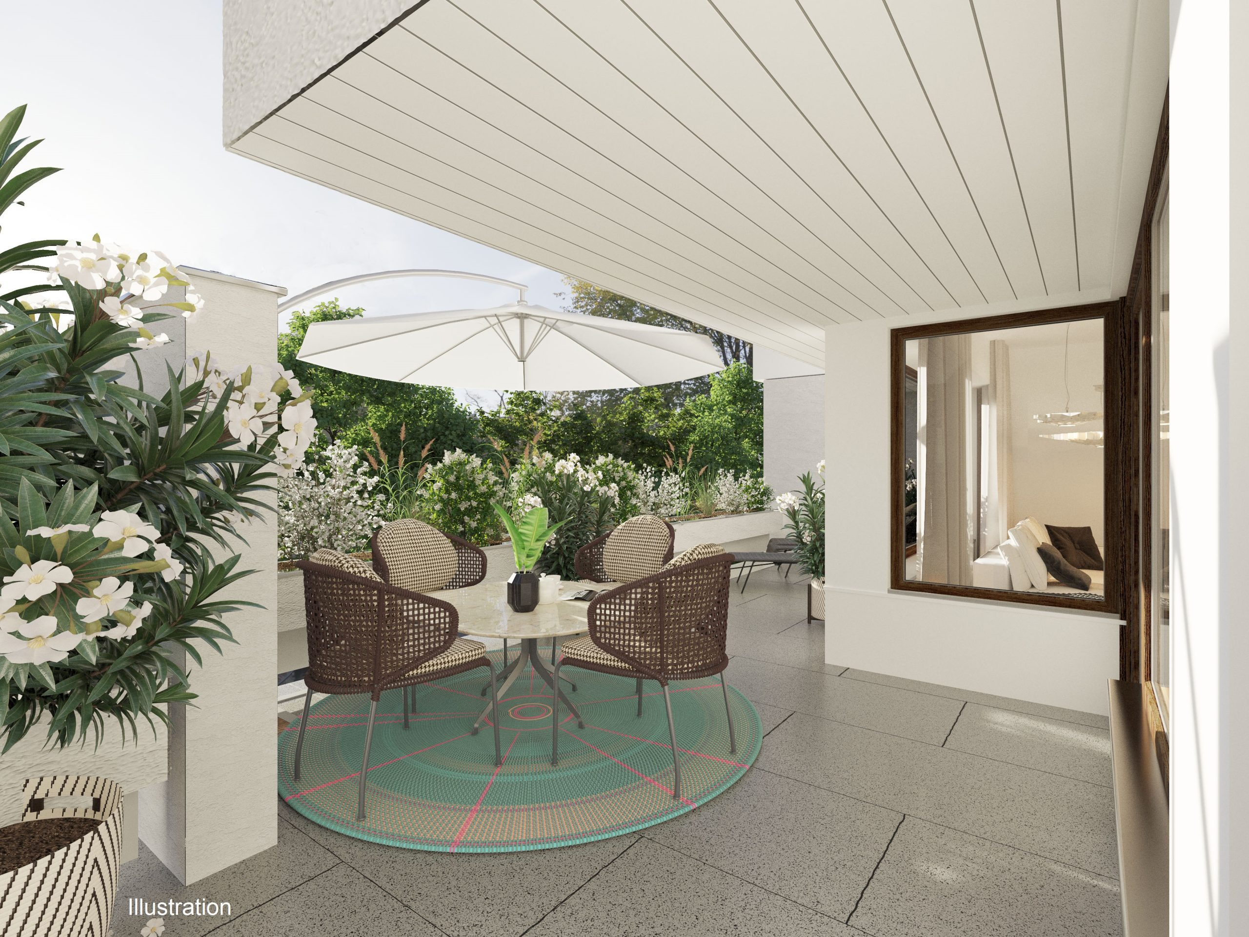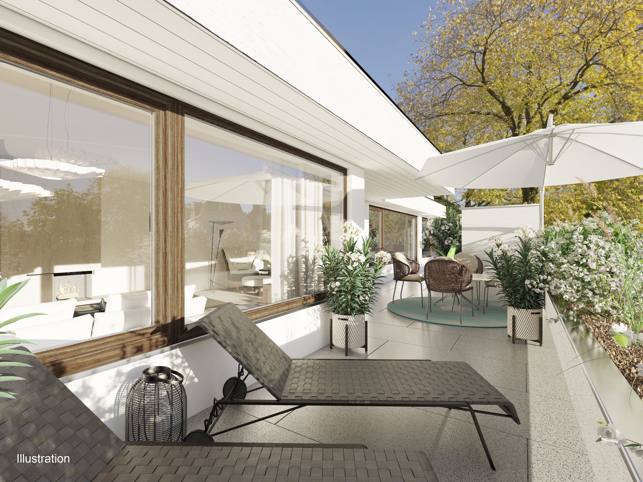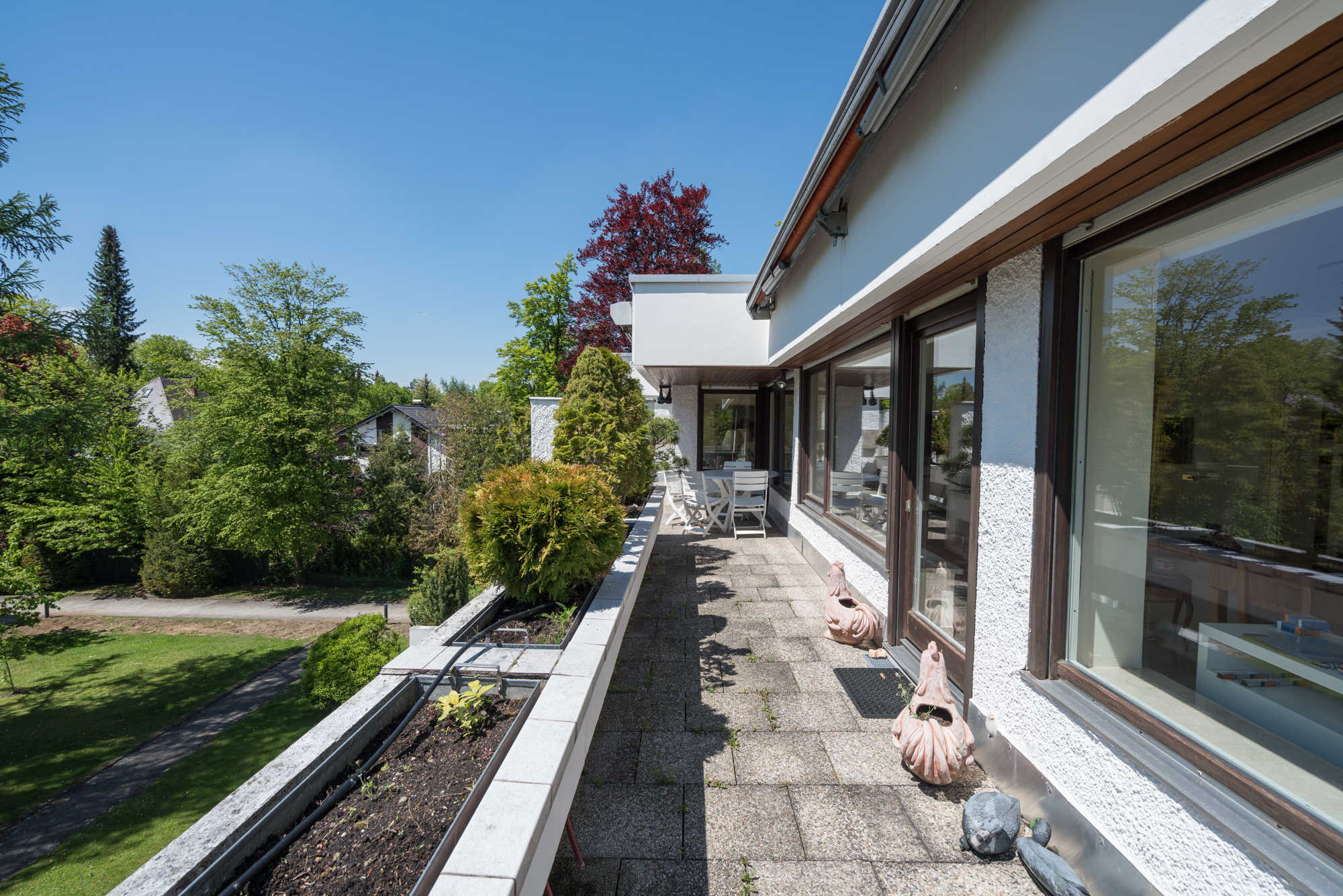 Auf der Terrasse lässt sich im überdachten Bereich ein toller Sitzplatz einrichten. Von dort haben Sie einen schönen Blick über die Gartenanlage mit einer denkmalgeschützten Gedächtnisstätte aus 1920 von Emanuel Seidl.