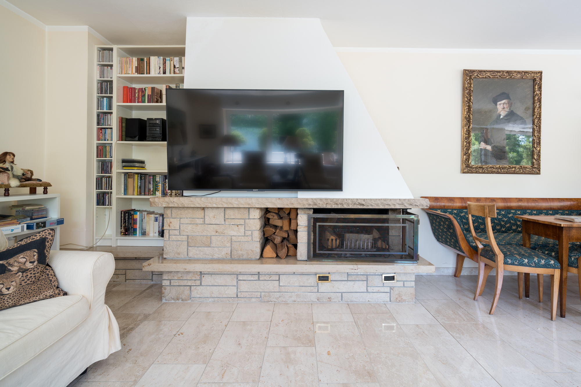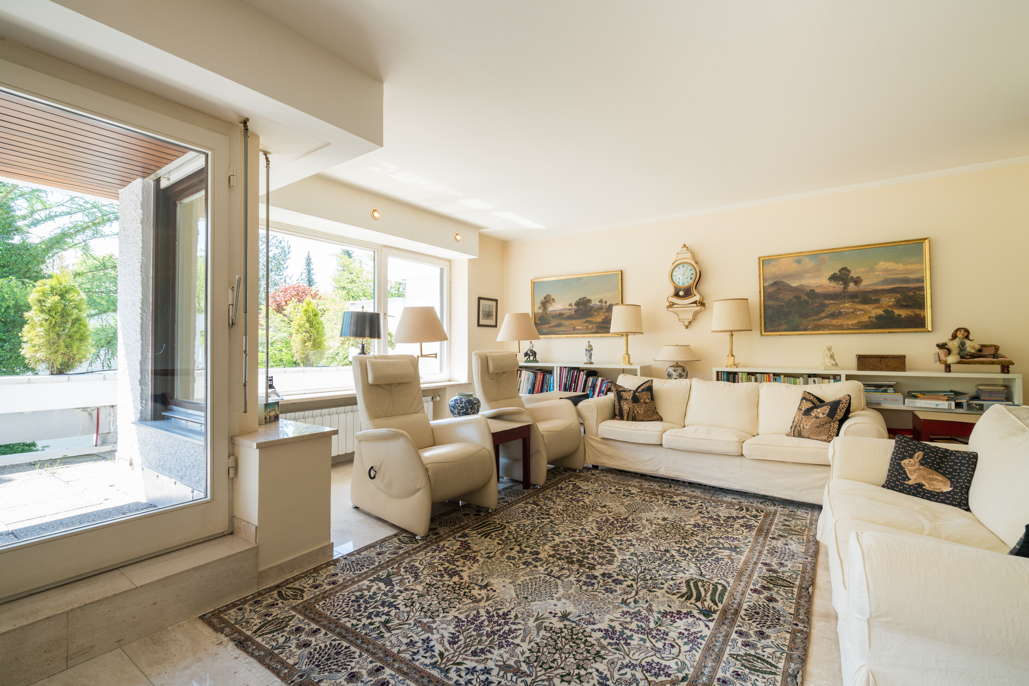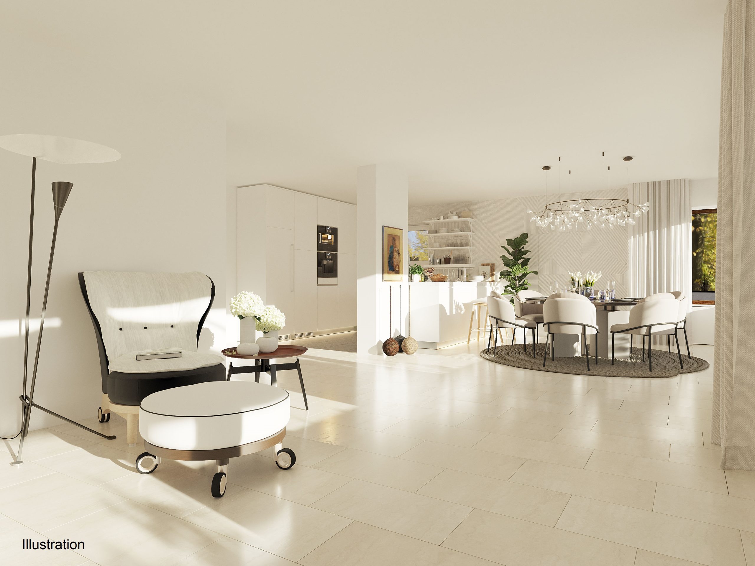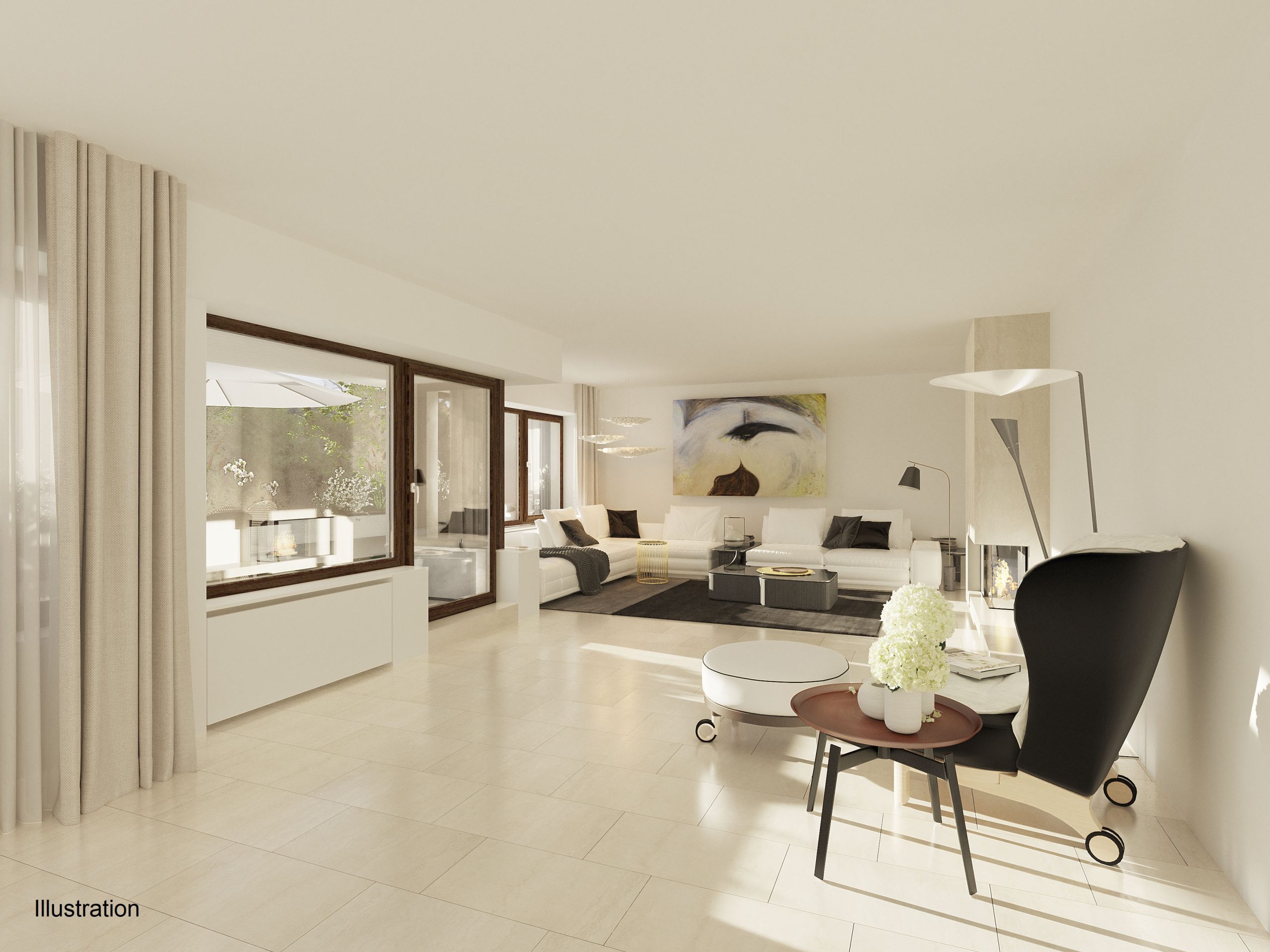 Die gesamte Wohnung ist schwellenlos mit cremeweißem Marmor ausgelegt und vermittelt eine lichtdurchflutete, helle Wohnatmosphäre. Der fast 60 m² große Wohn-Essbereich erstreckt sich über die ganze Südseite und bietet durch die große Fensterfront auch bei trübem Wetter viel Licht. Vor dem offenen Kamin, der sich in das Gesamtbild einpasst, können Sie behagliche Stunden verbringen.