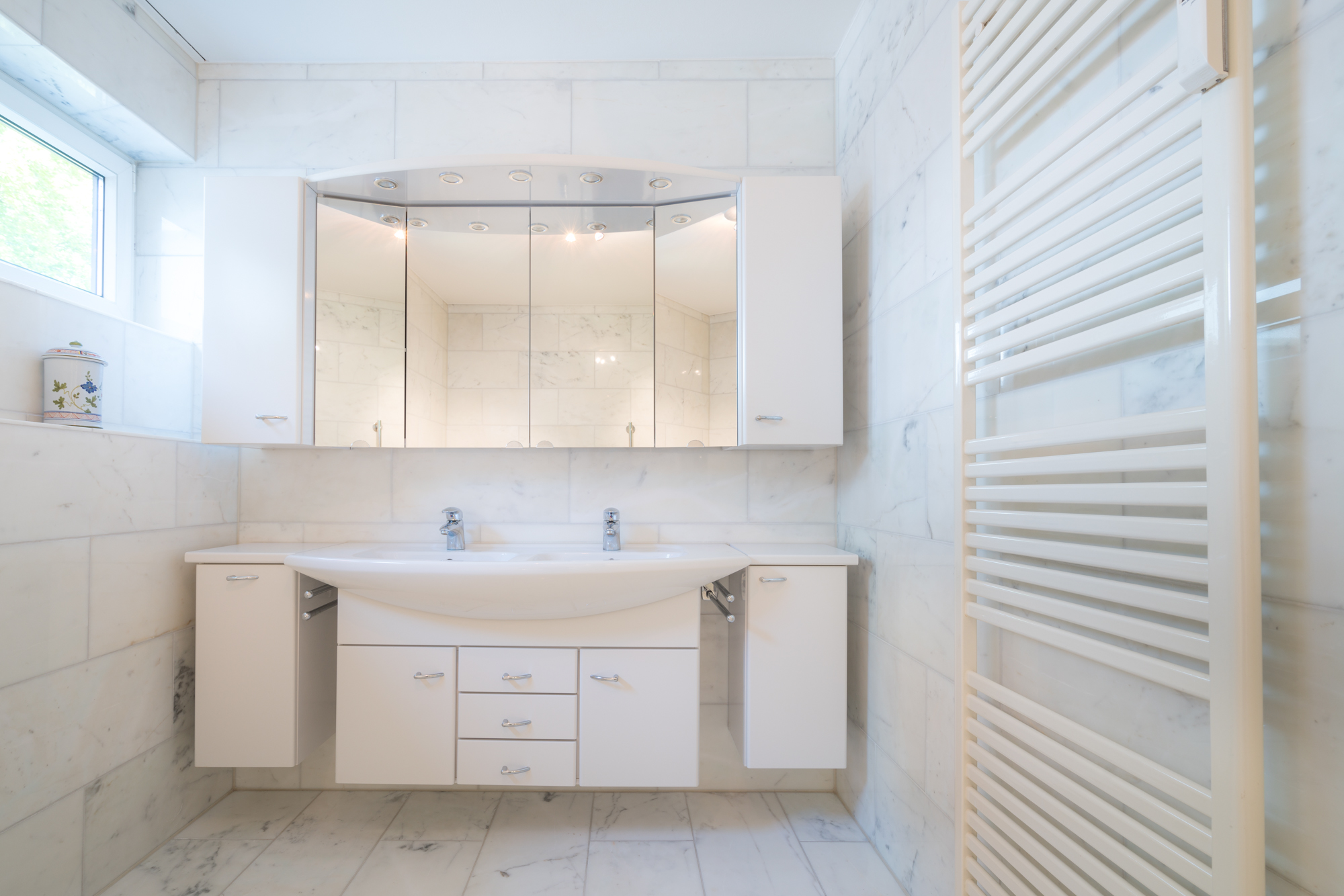 – geräumiges Bad komplett in weißem Marmor gestaltet mit Fenstern, Doppelwaschtisch, Badewanne, Dusche, WC und Bidet sowie Handtuchheizkörper