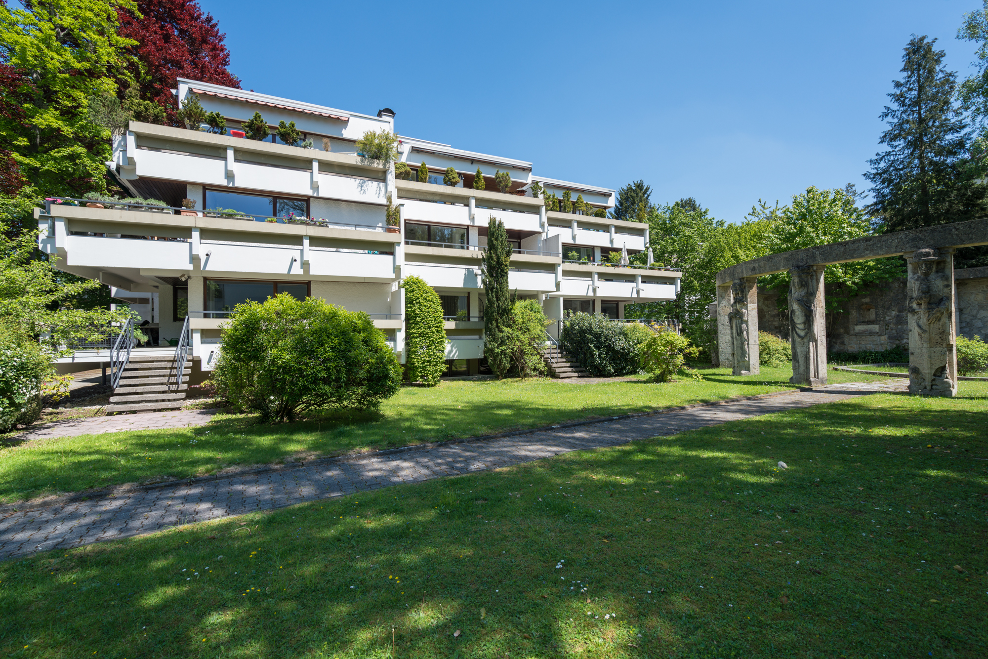 Auf einen ca. 9.300 m² großen Parkgrundstück wurden die 4 Gebäude Anfang der 70er Jahre errichtet. Die Dachterrassenwohnung ist umgeben von altem Baumbestand und sehr ruhig von der Straße abseitig gelegen.