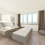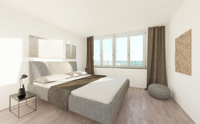 Freundliche, lichtdurchflutete Räume können Sie als Schlaf-, Arbeits- oder Kinderzimmer einrichten. Zur Verdunkelung befinden sich an allen Fenstern elektrische Senkrechtmarkisen.
