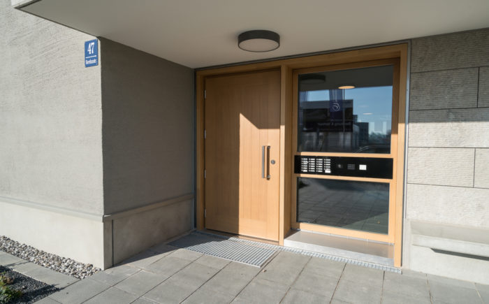 Die moderne Wohnanlage ist barrierefrei und vom Untergeschoss bis zur Wohnung mit einem Fahrstuhl ausgestattet. In der Tiefgarage ist ein überbreiter PKW-Abstellplatz für diese Wohnung vorgesehen. Für Elektrofahrzeuge stehen dort zwei Ladestationen zur Verfügung. Fahrräder können in mehreren abschließbaren Fahrradräumen untergebracht werden. Diese sind bequem über die Tiefgarage erreichbar.