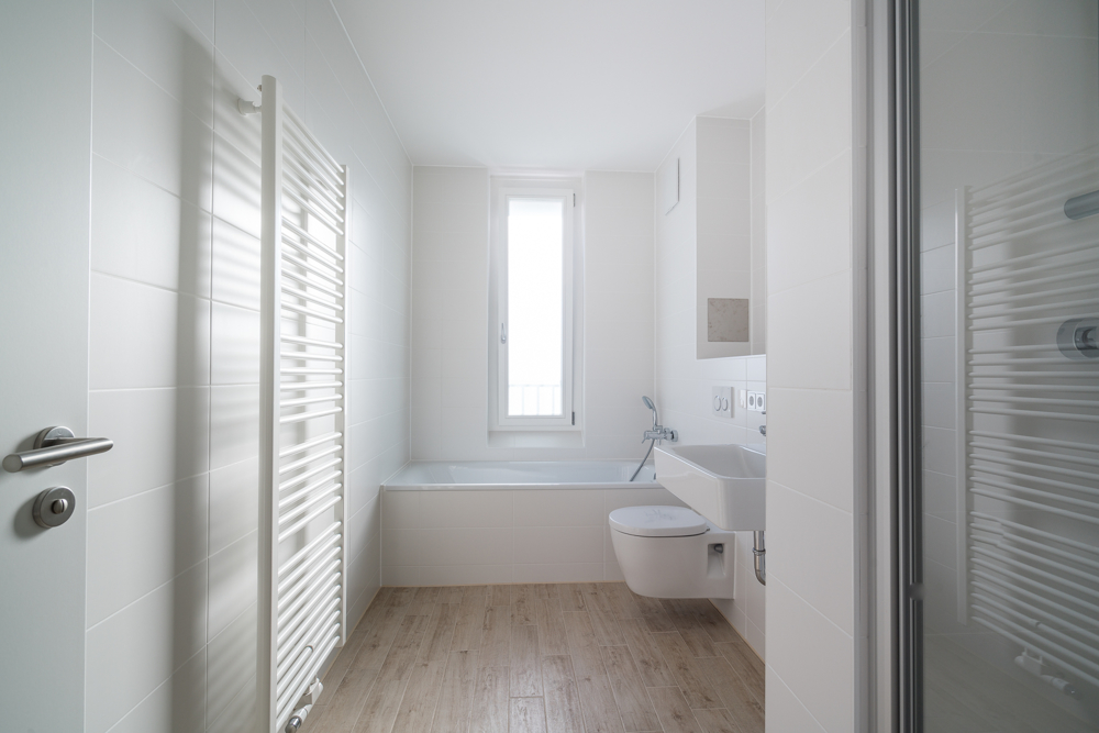 – Designer-Badausstattung von Grohe, Kermi, Ideal Standard und Kaldewei mit Badewanne, überbreitem Waschbecken, Handtuchheizkörper, bodengleiche Dusche mit Echtglasduschwand, WC