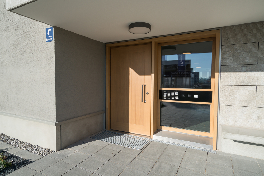 Die moderne Wohnanlage ist barrierefrei und vom Untergeschoss bis zur Wohnung mit einem Fahrstuhl ausgestattet. In der Tiefgarage ist ein überbreiter PKW-Abstellplatz für diese Wohnung vorgesehen. Für Elektrofahrzeuge stehen dort zwei Ladestationen zur Verfügung. Fahrräder können in mehreren abschließbaren Fahrradräumen untergebracht werden. Diese sind bequem über die Tiefgarage erreichbar.